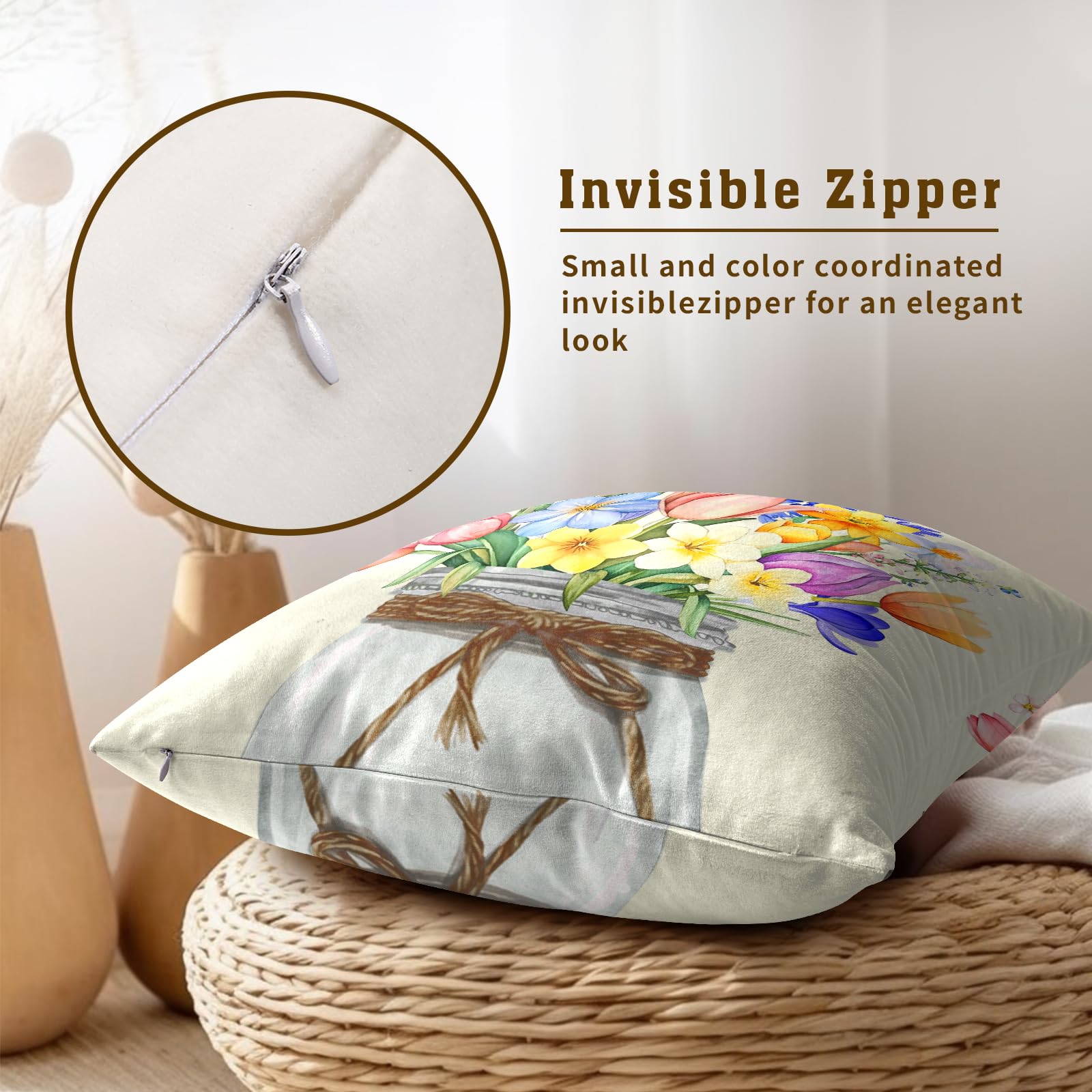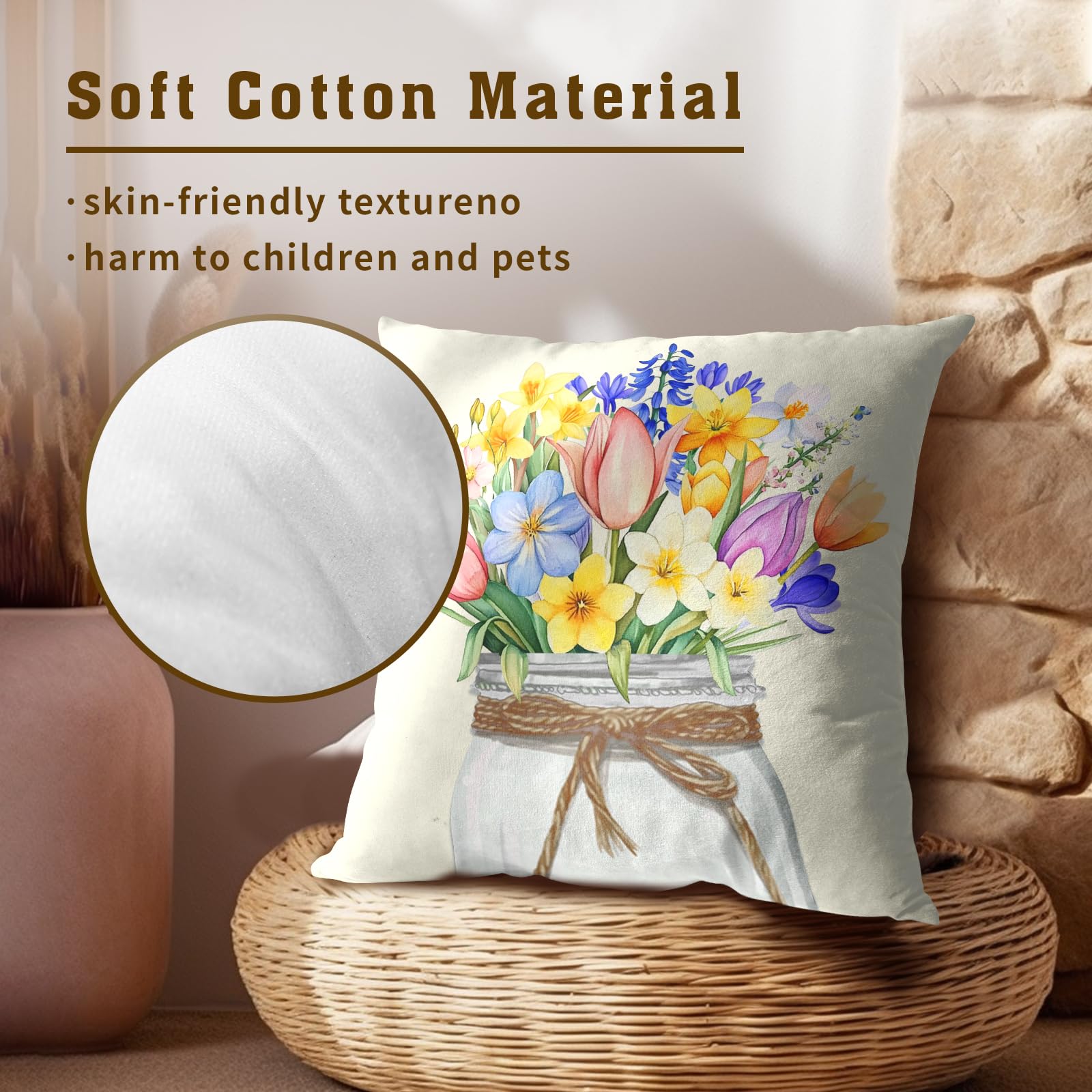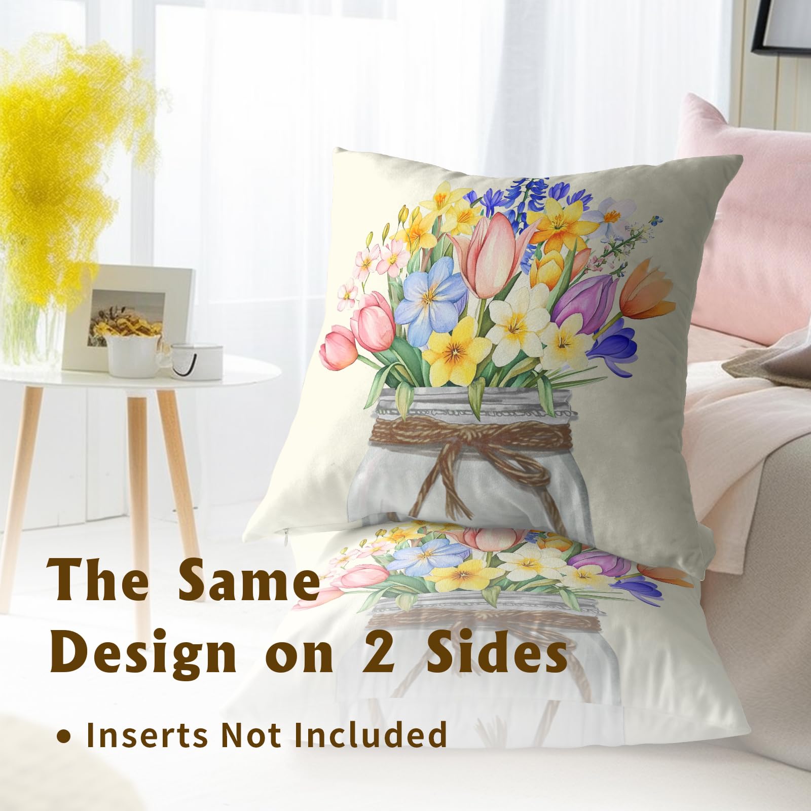 Easter Flowers Throw Pillow Covers 18x18 Set of 2, Spring Tulip Lavender Floral Mason Jar Square Pillowcases Cotton Cushion Cover Decoration for Couch Sofa Living Room Bedroom Home