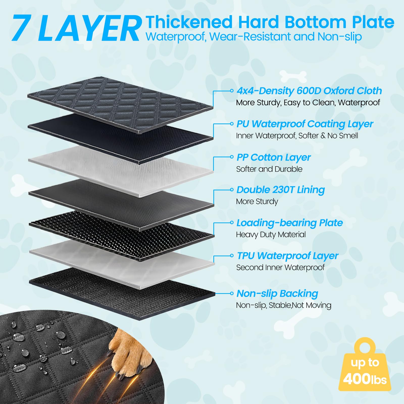 - 7-LAYER SELECT DURABLE MATERIAL: Our waterproof dog hammock for car is made of 7 layers of high quality material; 4x4 density of 600D Oxford cloth making the dog car seat cover stronger and easier to clean; PVC coating and TPU waterproof layer composed of double waterproof layer better than other single-layer waterproof layer; PP cotton layer above the removable bottom board increases softness; Bottom non-slip dot rubber makes dog cover more secure, preventing your dog from slipping