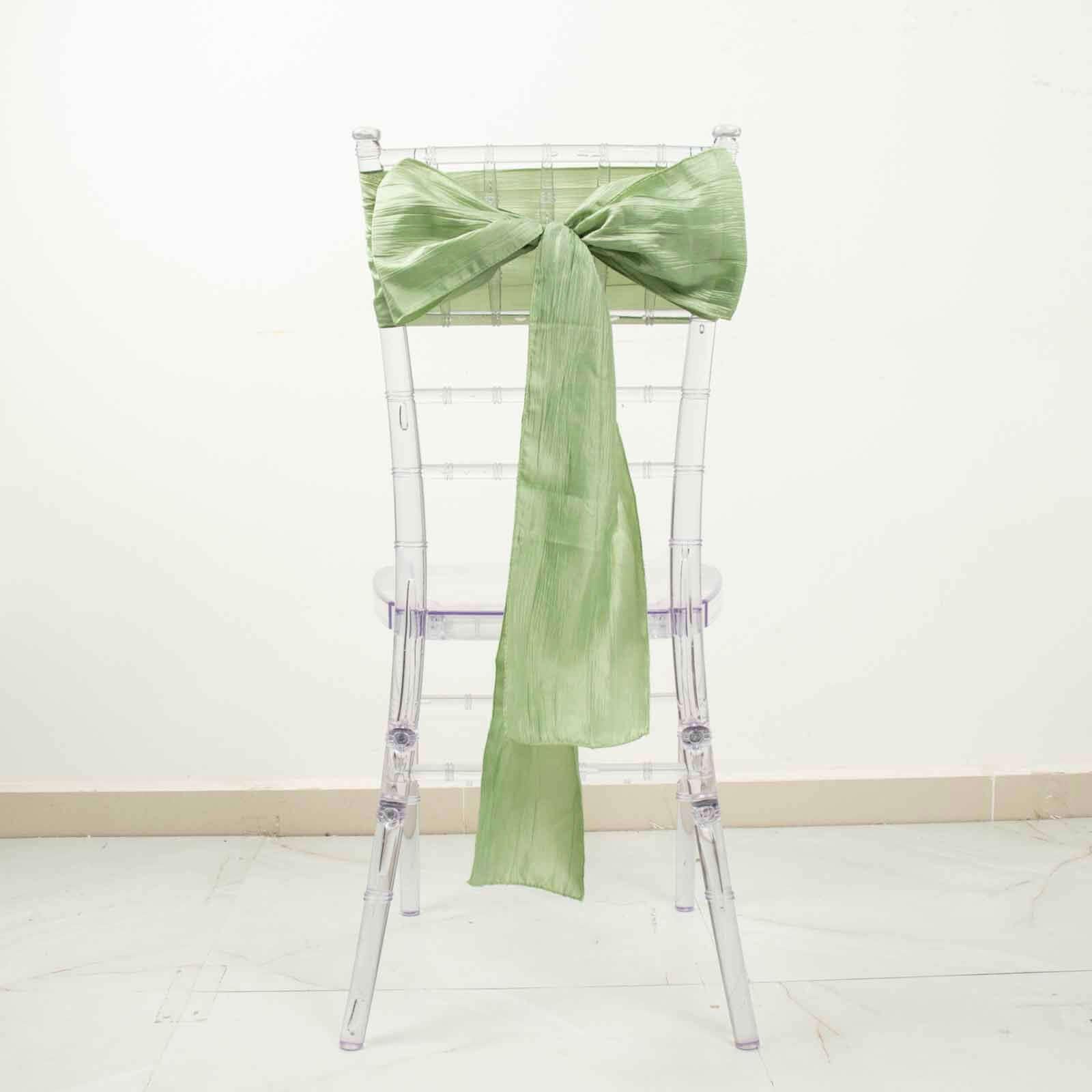 - Quantity: 5 Sashes Material: Crinkle Taffeta w/ Metallic Shine Finish Color: Sage Green Style: Accordion Crinkle Taffeta Chair Sashes Size: 6'W x 106'L Edges: Serged