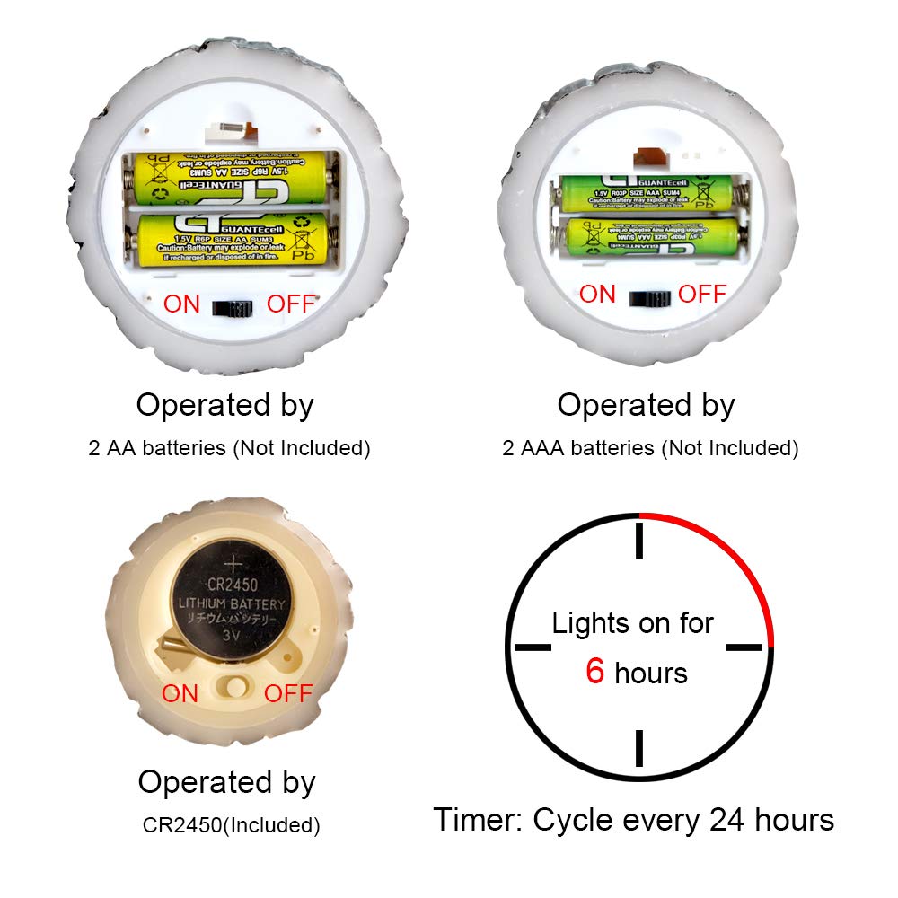 - 6 HOUR TIMER: Bottom two-way ON-OFF switch, once turn on these candles, the timer activated automatically, 6 hours on and 18 hours off, timed to light on at the same time second day, cycle every 24 hours.