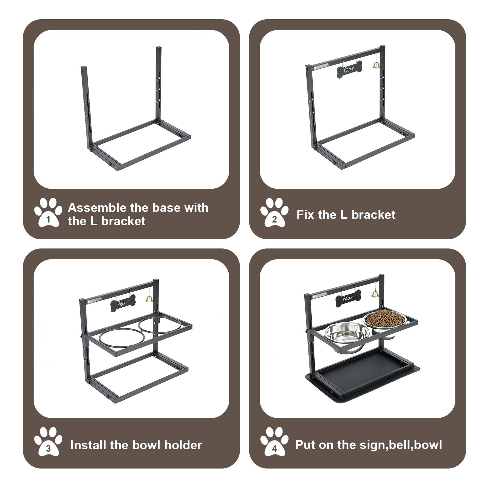 - PET INTERACTION: Special bells can be used to call your pet to eat. This dog bowl holder kit comes with a free white pen that you can use to write on the sign. Spilled water and food will land nicely on the mat