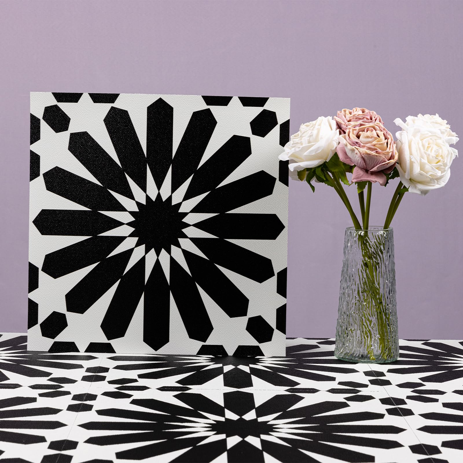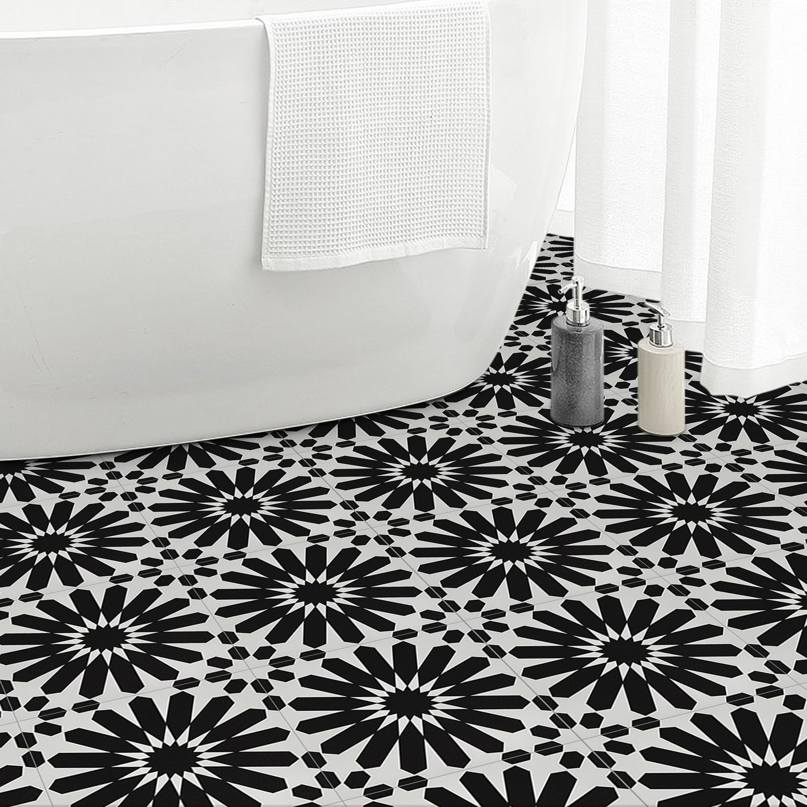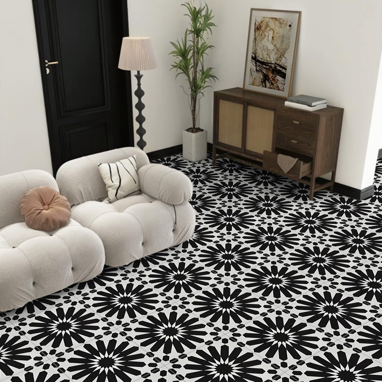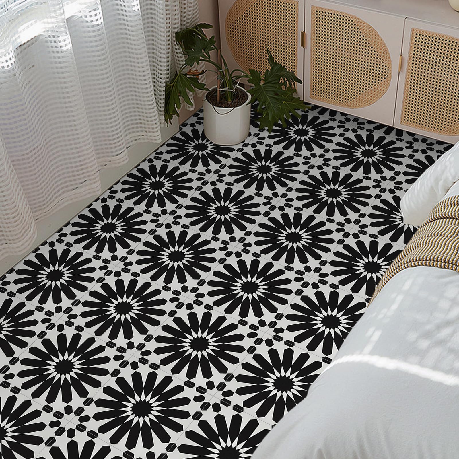 - 【Detail】This peel-and-stick floor tile has a fine granular texture that increases friction and creates a low gloss texture, the classic black and white tones are made up of a sunflower-shaped pattern, which brings you a new visual experience, and can be cleaned at regular intervals, so feel free to contact us if you have any questions