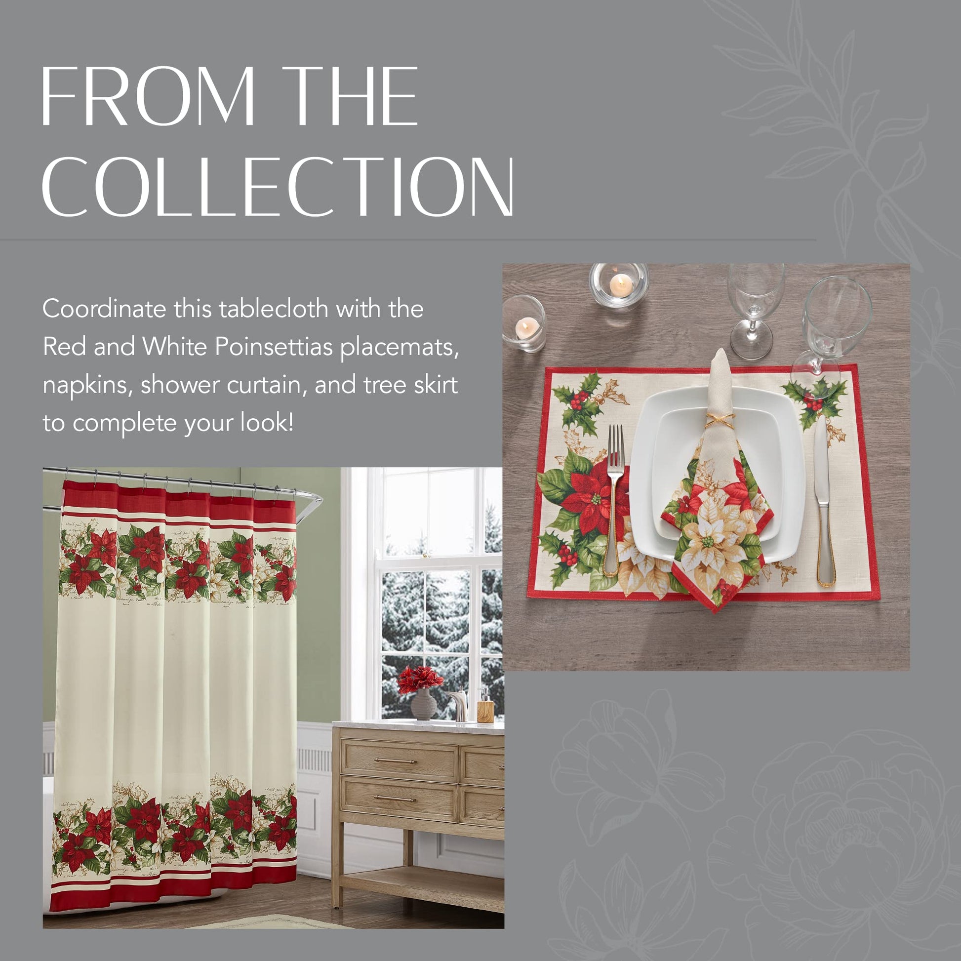 Details: Elrene Home Fashions provides fashionable home decor to suit any decorating taste. Share a meal in style with family and friends this Christmas season with our Red and White Poinsettia Fabric Christmas Tablecloth. Perfect for family gatherings or as a Christmas banquet tablecloth, this long tablecloth is sure to impress guests and family alike. Add it to your Christmas decorations or pair it with our matching napkins to add a touch of floral seasonal fashion and simple elegance to your home.