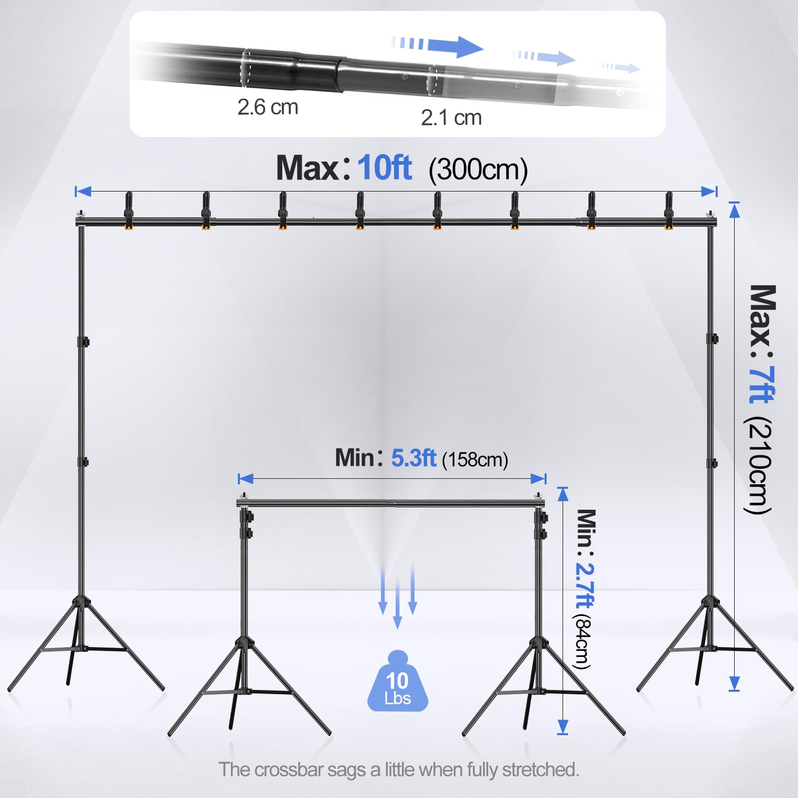 - 【Retractable Crossbar】The retractable design makes the crossbar more flexible in use. Users can adjust to the appropriate width (5.3ft/1.58m–10ft/3m) as required to adapt to different sizes of background backdrop.For a good decorative effect, it is best not to hang objects over 10lbs