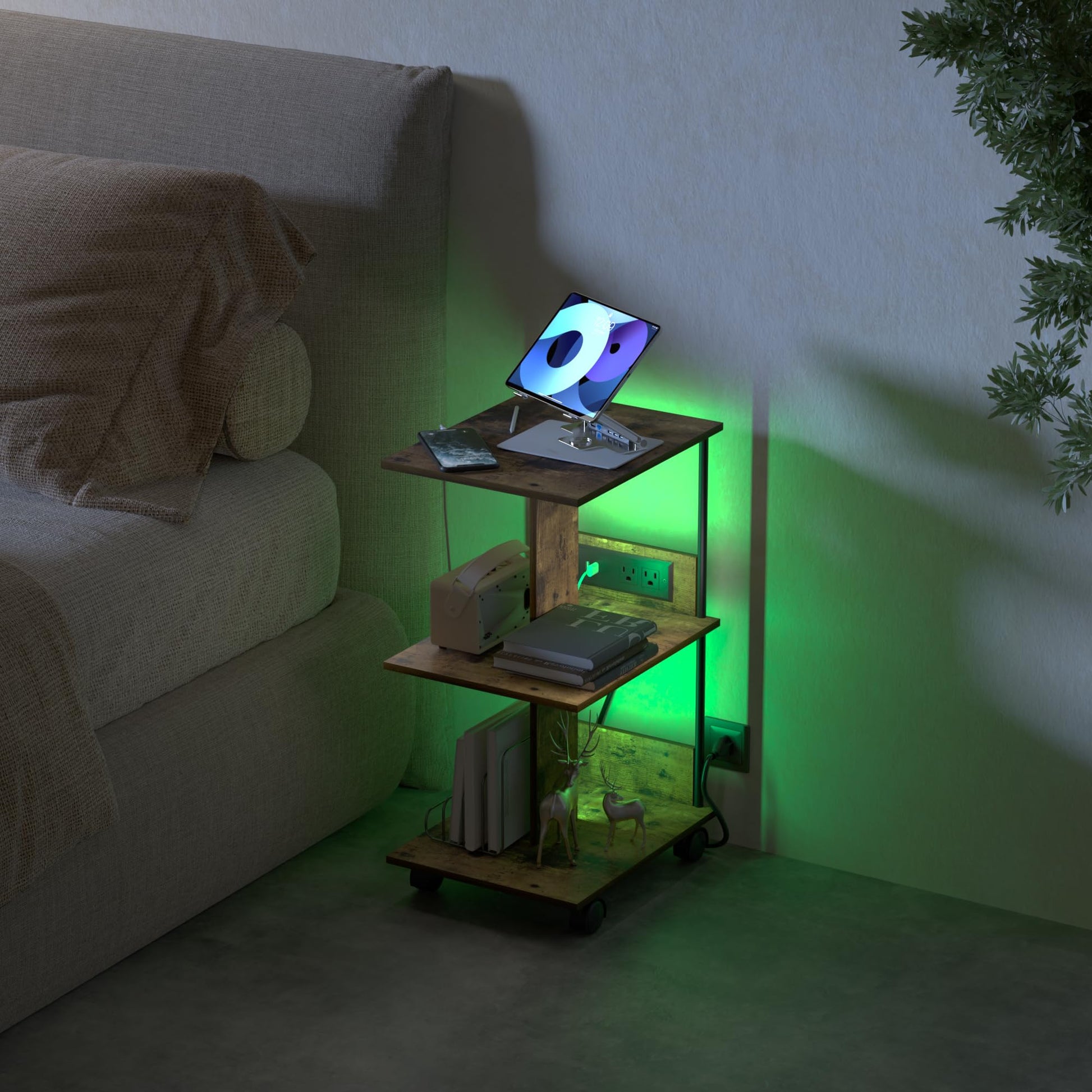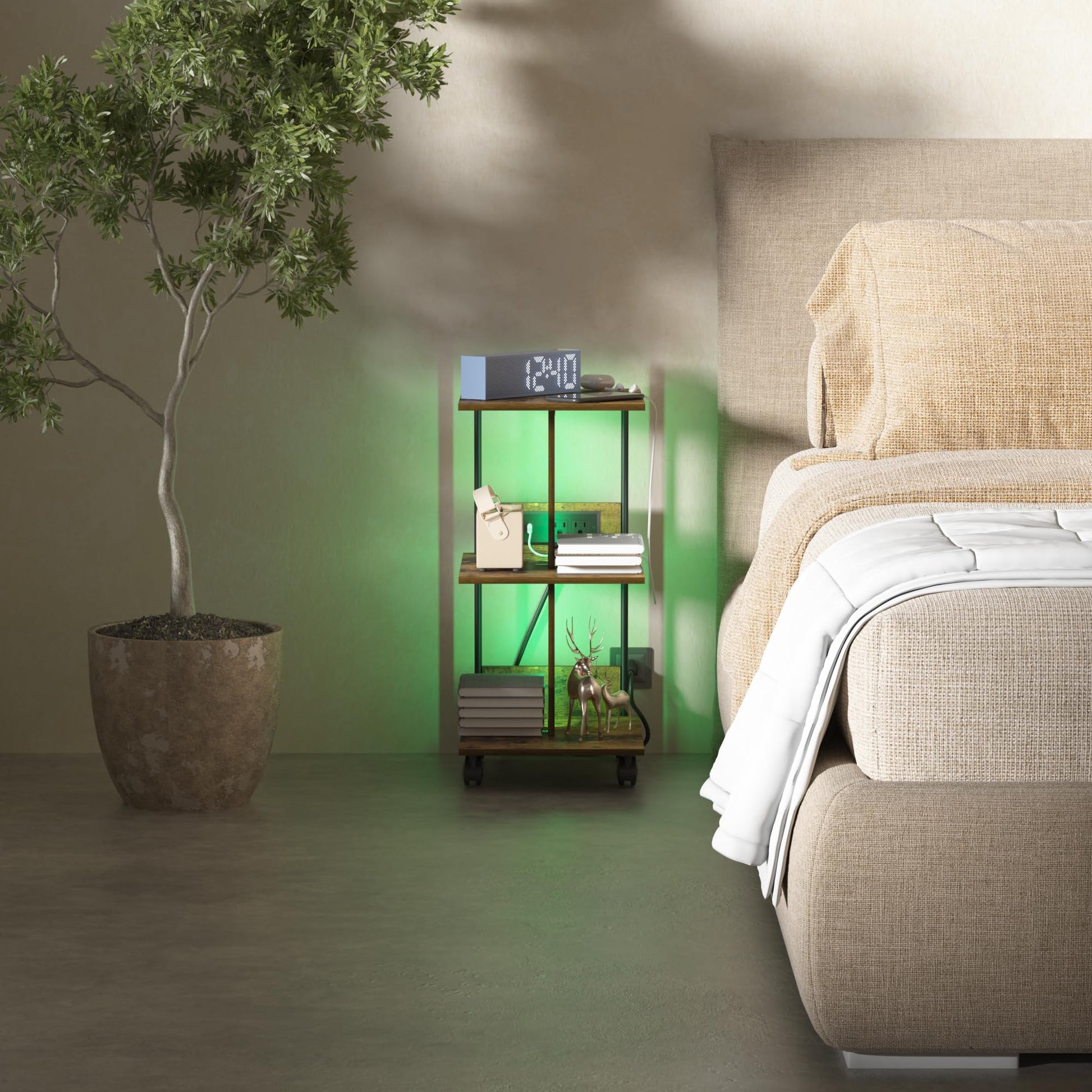 End Table with Charging Station & LED Lights, 3 Tier Movable Wooden Nightstand with Wheels Storage Shelves, Narrow Bedside Tables Side Table for Living Room Bedroom Home Office, Easy to Assemble