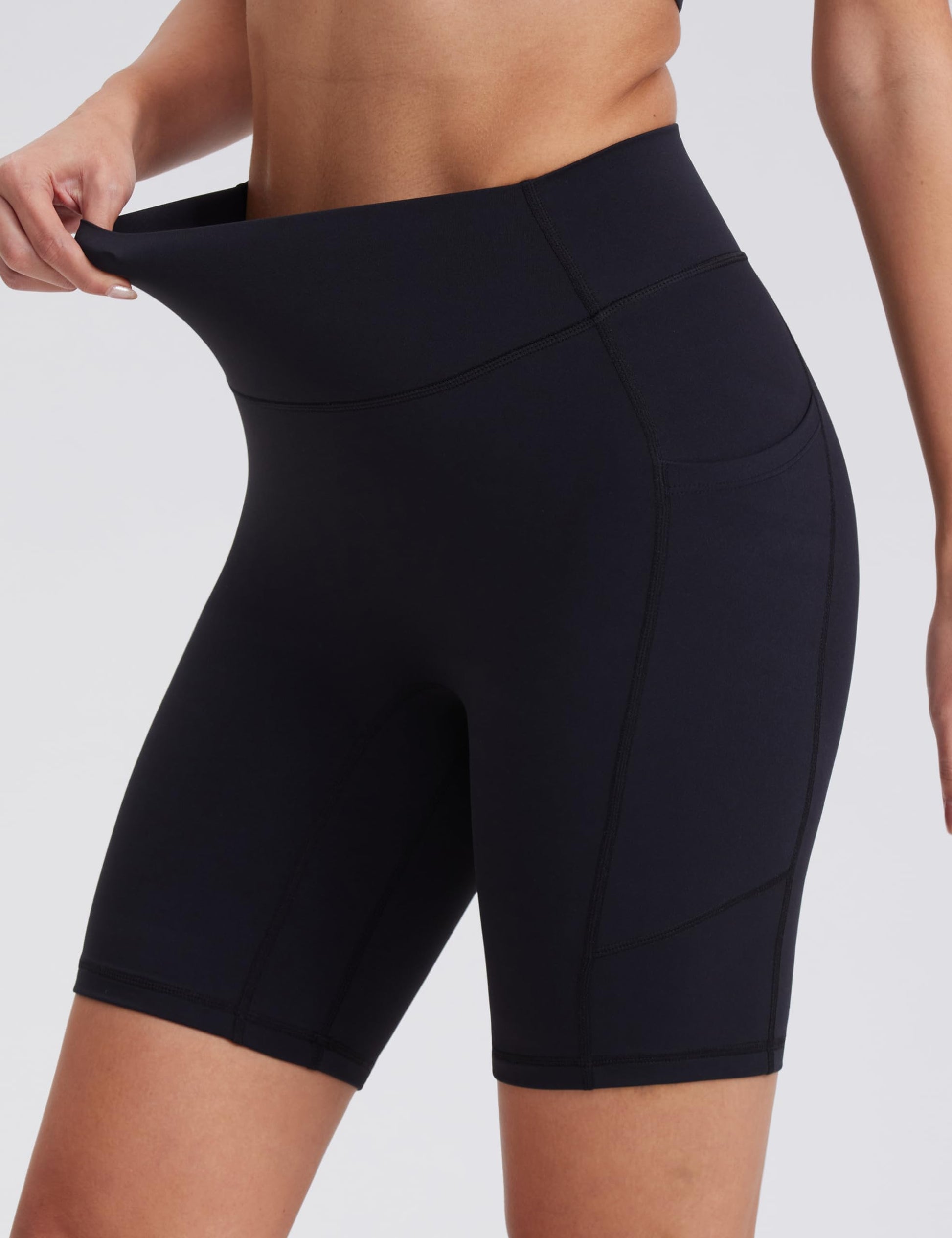 - High Waisted 8”Shorts : High-waisted gym shorts provide tummy control and the waistband has the excellent compression to without curling at the waist in during exercise.