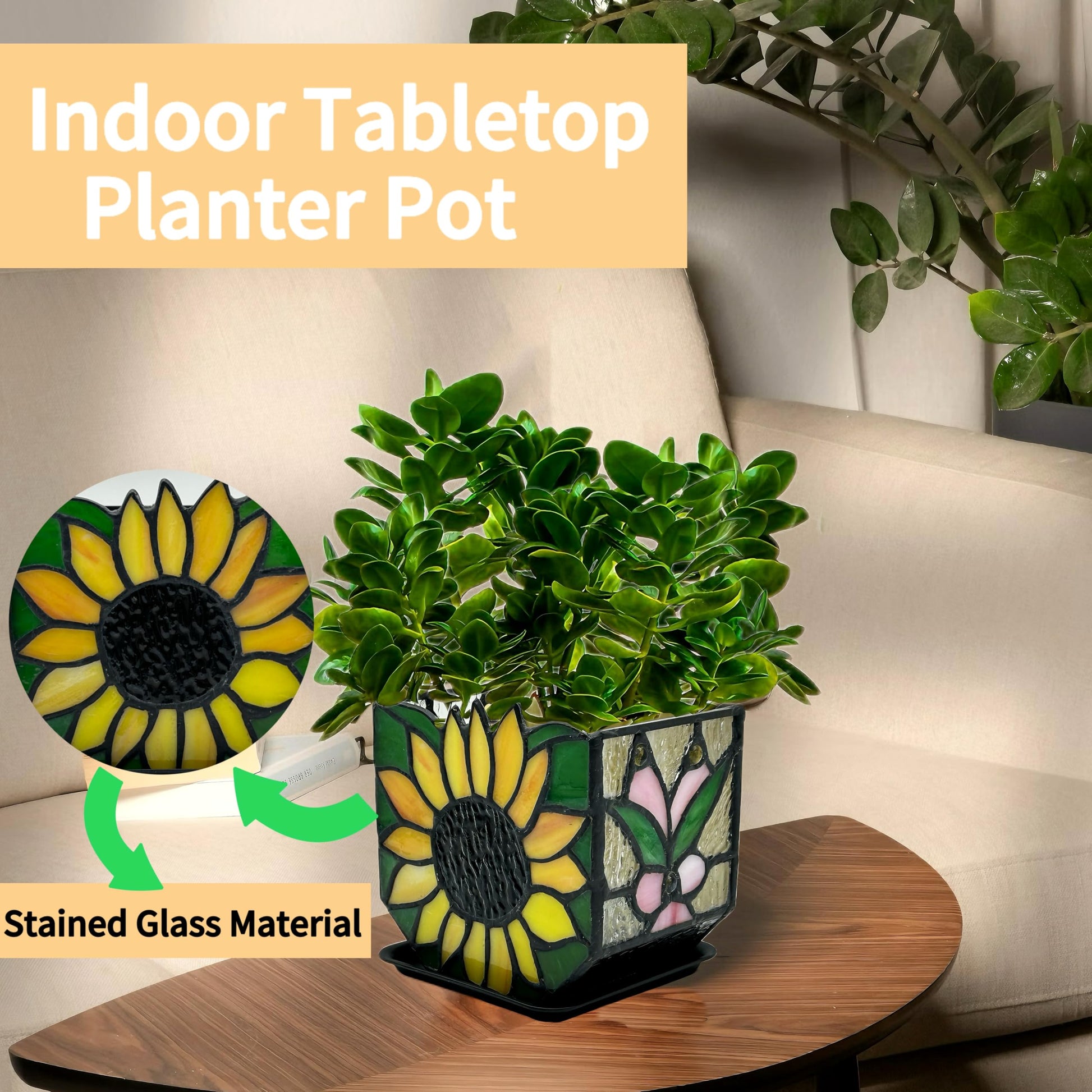 Entlityful Stained Glass Sunflower Garden Planters,Indoor Plant Pots with Drainage,Unique Plant Pots for Dried Flowers,Sunflower Gifts,4.6 x 3 x 5.15 in