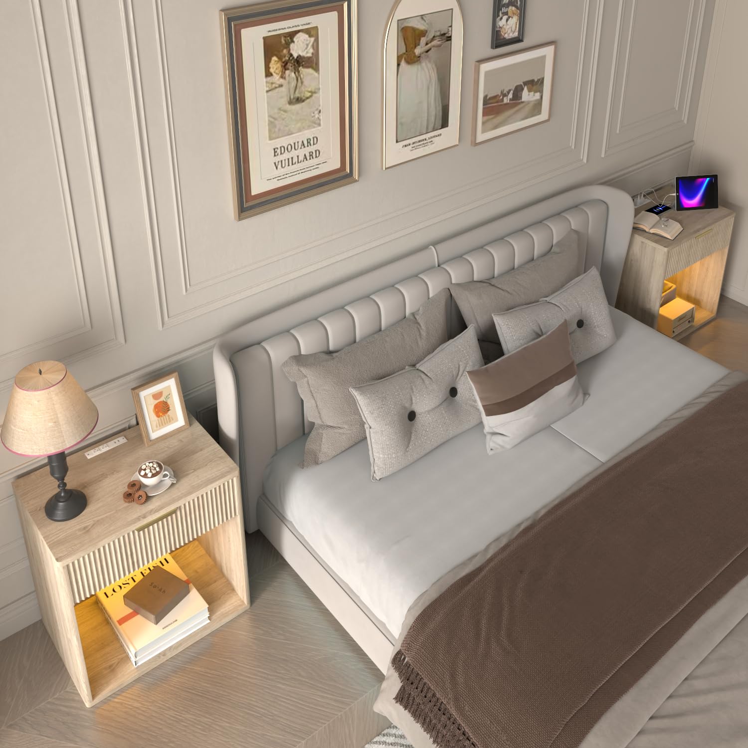 EROMMY Fluted Nightstand with Charging Station, 23” Wide Modern Bedside Table with Drawer, Mid Century Nightstand End Table for Bedroom, Curved Profile, Natural Oak