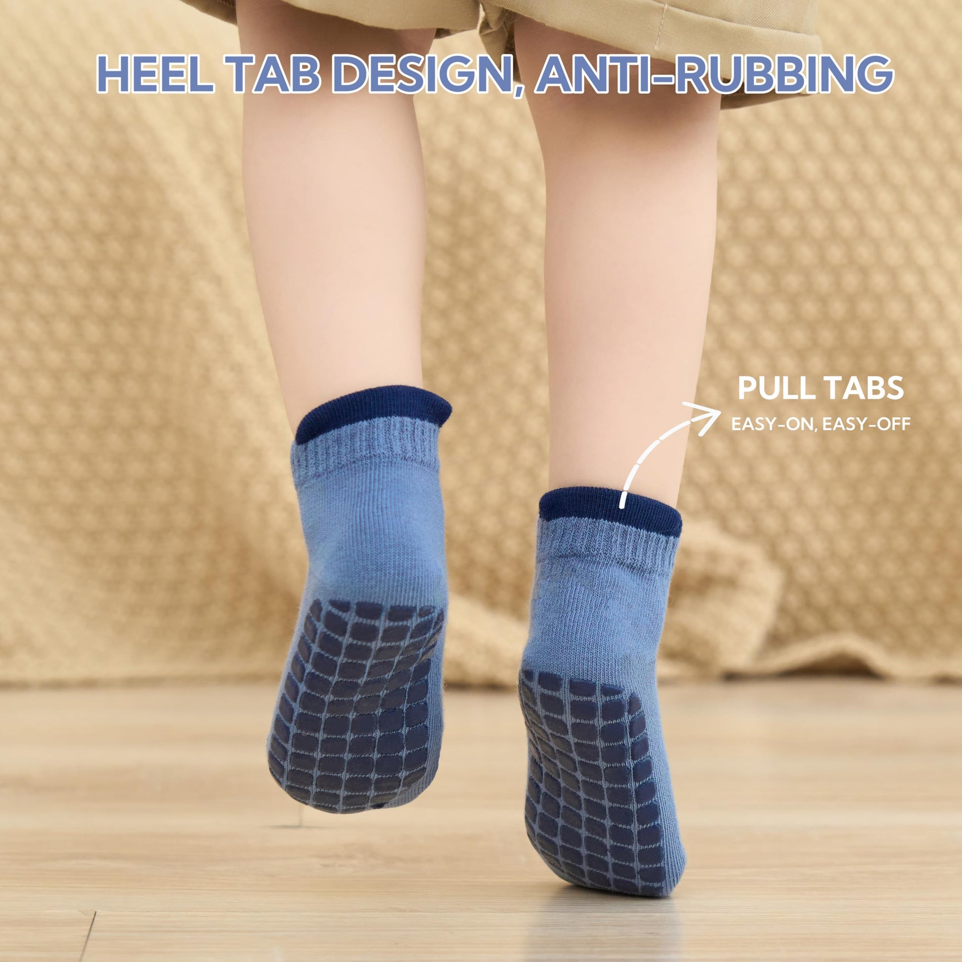 - The pull tabs behind the ankle helps the mom to put on and take off the socks very easily, the elastic ribbed cuffs prevent the socks from falling off, the non-slip grippers on the base offers good protection at stopping slips for your baby
