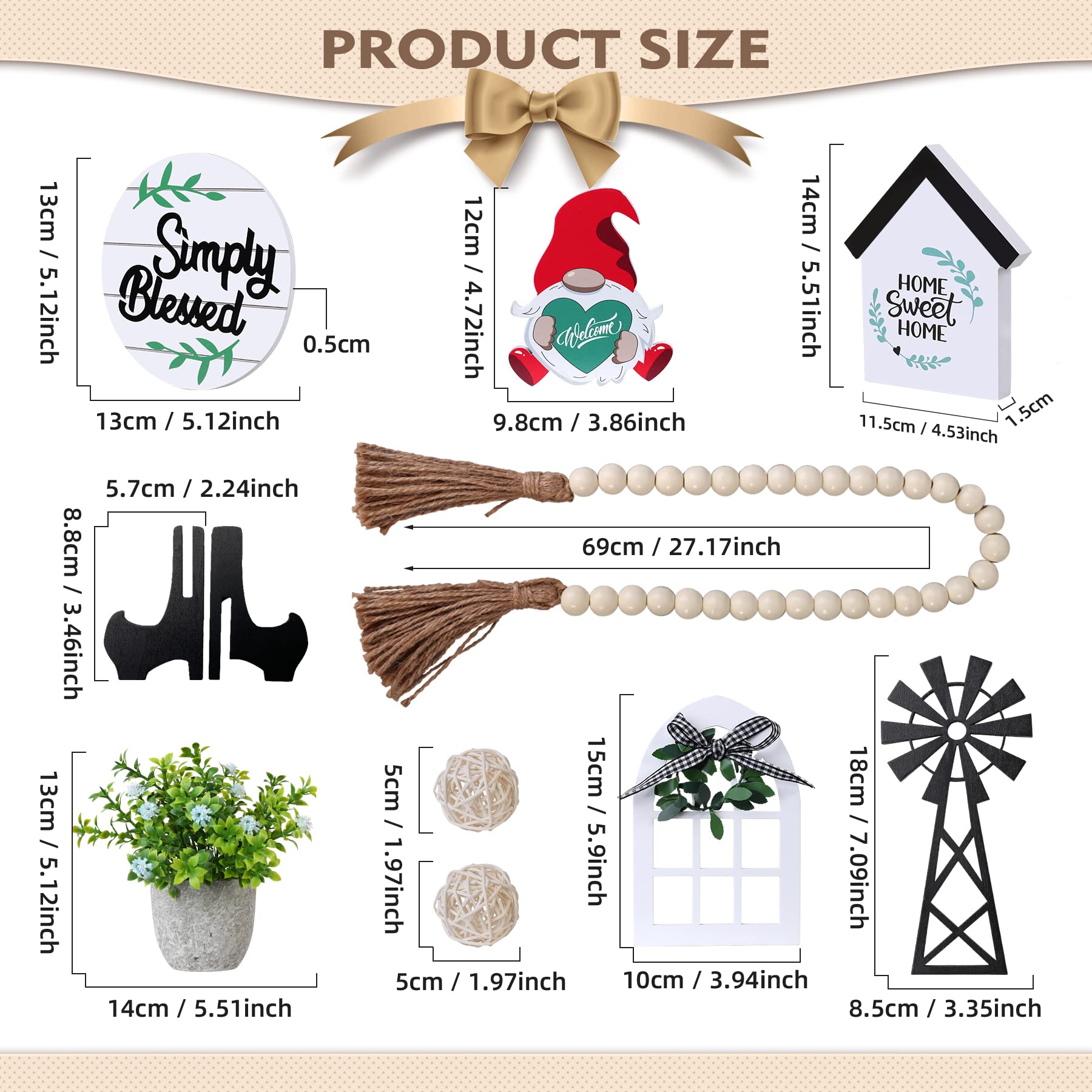 - TIER STAND NOT INCLUDED: The 11-Piece farmhouse tier tray decor set includes black and white buffalo plaid gnomes ornaments(front), red christmas gnomes(back), Home Sweet Home sign(front), love sign(back), Simply Blessed sign, mini window, windmill, 2 mini stand, bead decor garland, artificial greenery, 2 rattan ball.