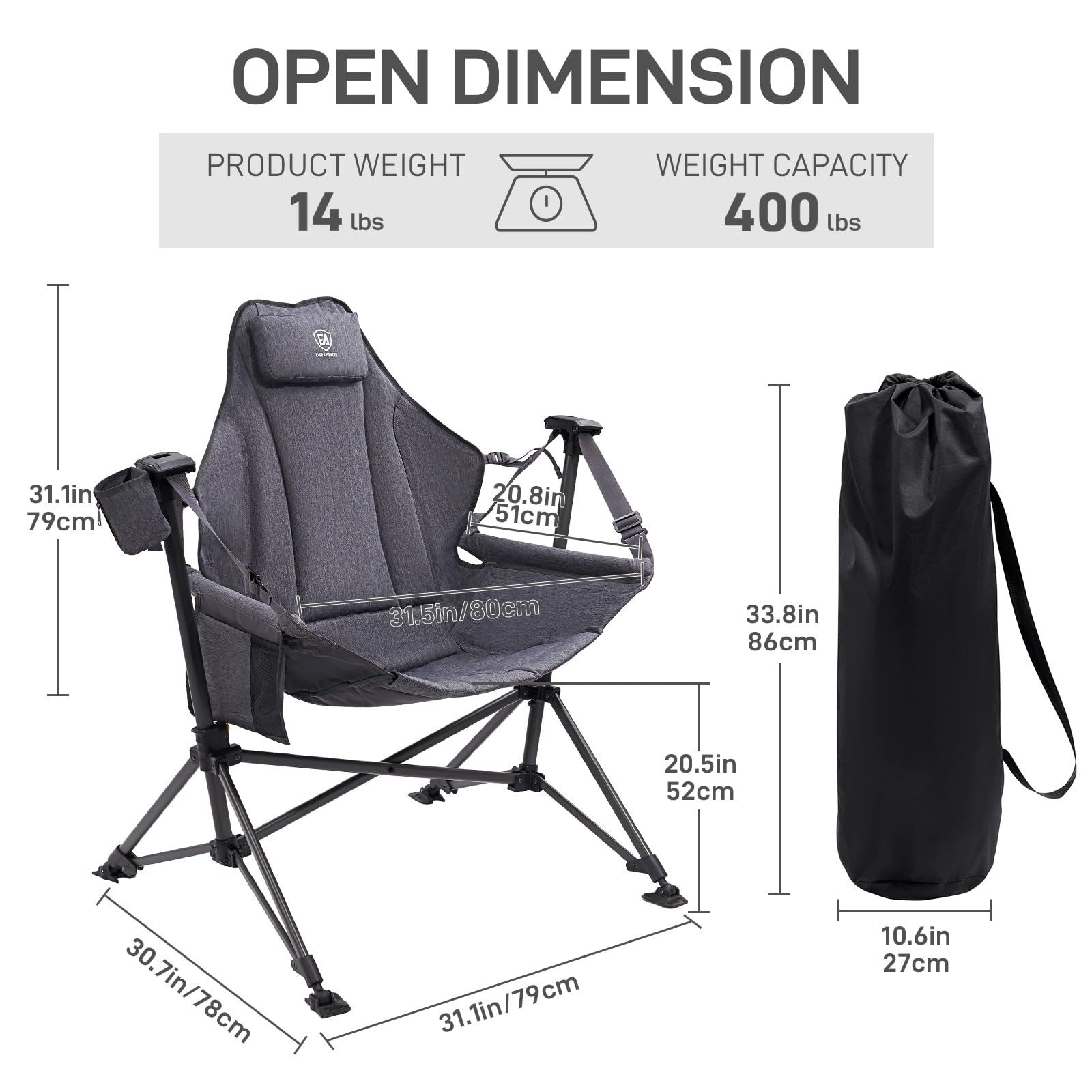 - 【Adjustable Design】: This camping swing chair's seat height and backrest angle can be easily adjusted to your liking. Put your hands on the side armrests and you can enjoy a relaxing rocking time anywhere you want. Comes with a detachable cup holder,you can place it on the left or right side depending on your preferences.