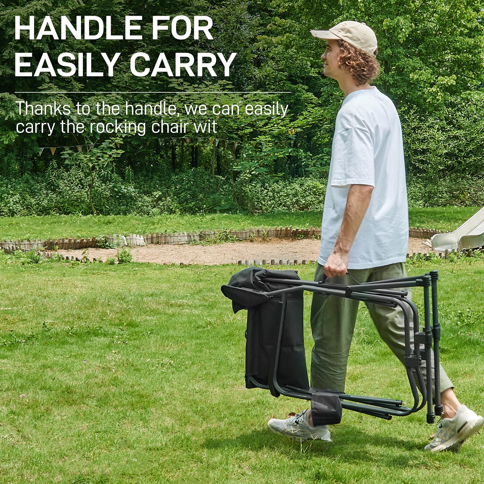 - 【Quick & Simple Assemble】Only 3 seconds required to unfold this camping rocker chair! What you need to do is holding the seat frame and pushing down with force. Folding up is just as quick, steping on the bottom frame and lifting up.