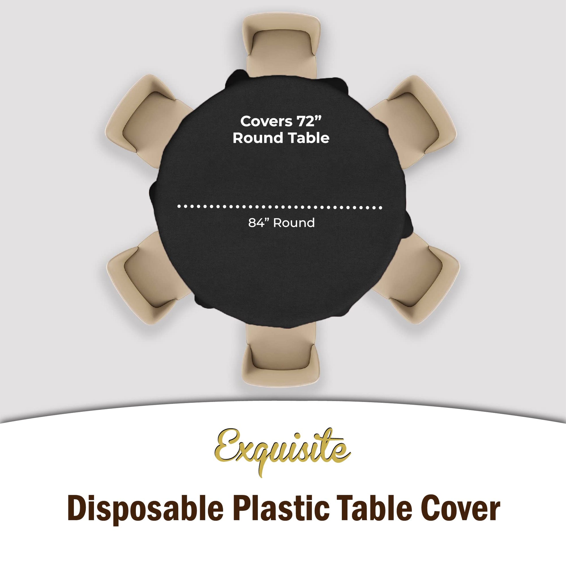 - PREMIUM QUALITY PROTECTION: This 12 pack of 84 in. Black Round plastic tablecloths will cover any table up to 7 feet. Unlike your typical paper table clothes these disposable table covers for parties are spill and waterproof!!!