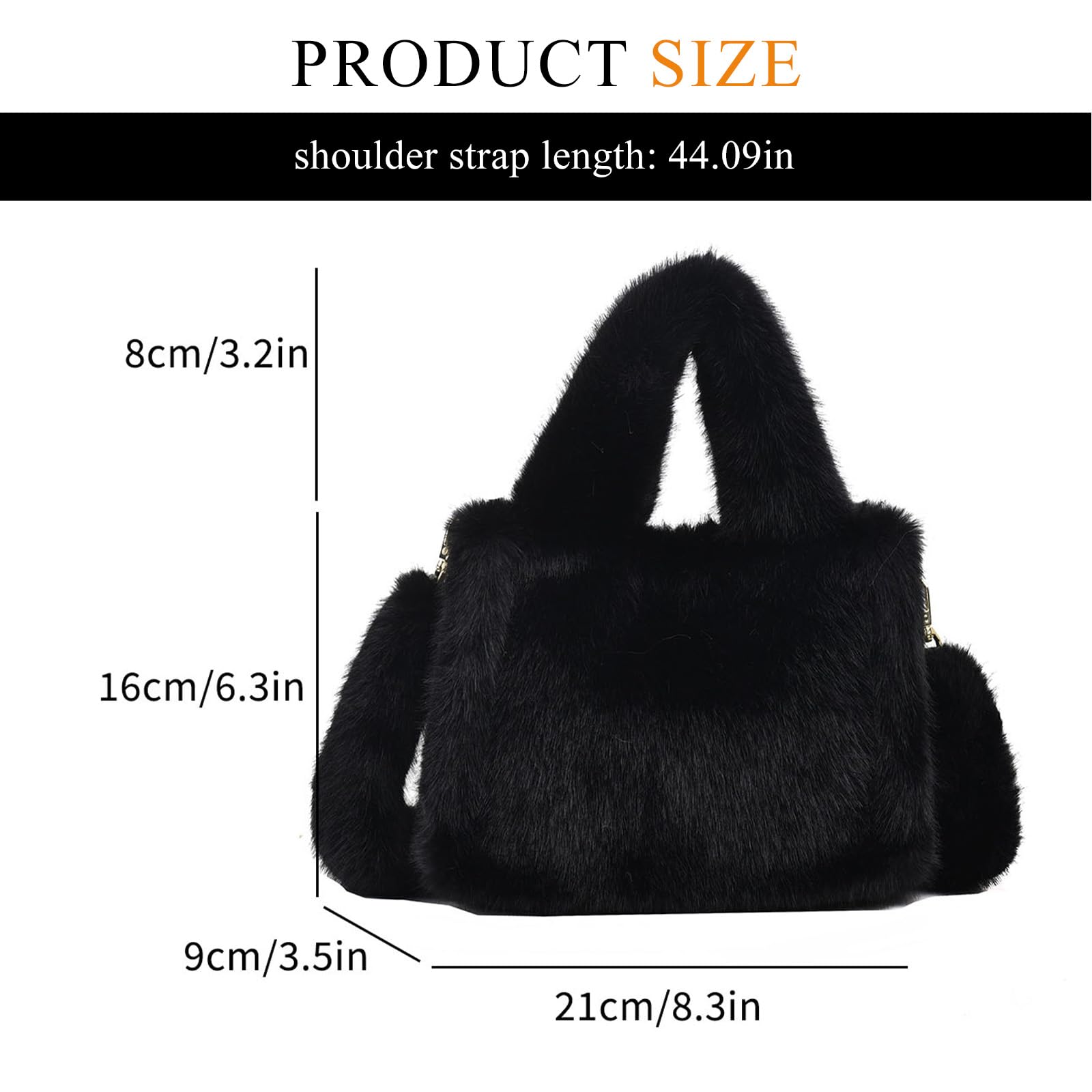 - Size: The size of this fur bag is 8.27*3.54*6.3 in. It is small in size and compact in design, but it can hold daily necessities such as mobile phones, wallets, lipsticks and other small items, and can effectively use space.