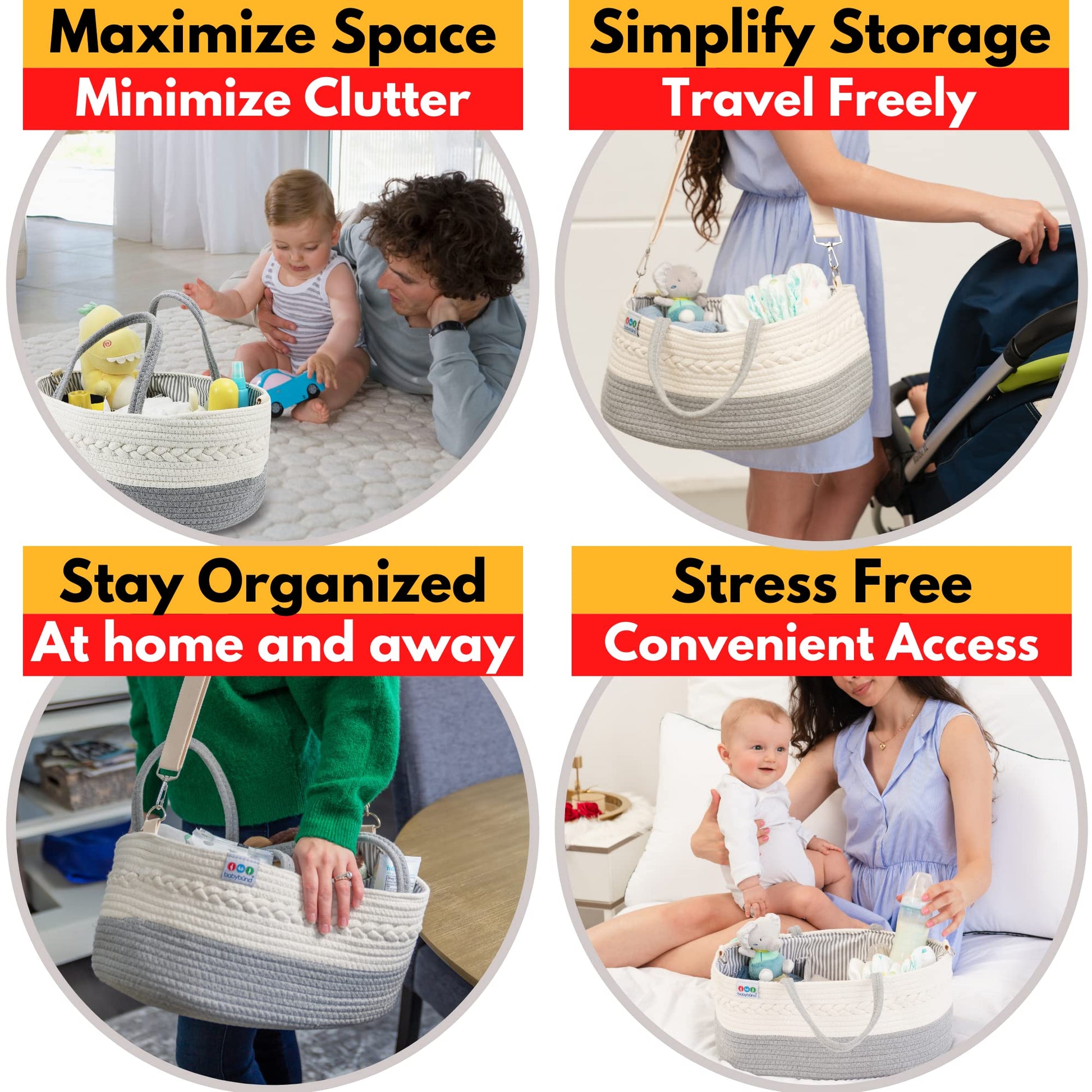 - ✈️ BRING IT ANYWHERE; VERSATILE AND PRACTICAL - Small enough to fit in a changing table storage shelf or in your car you can bring your diaper storage organizer wherever you and your baby travel at home or outside; Portable lightweight nursery basket design makes for user friendly one-handed operation with added adjustable shoulder strap and ergonomic handles
