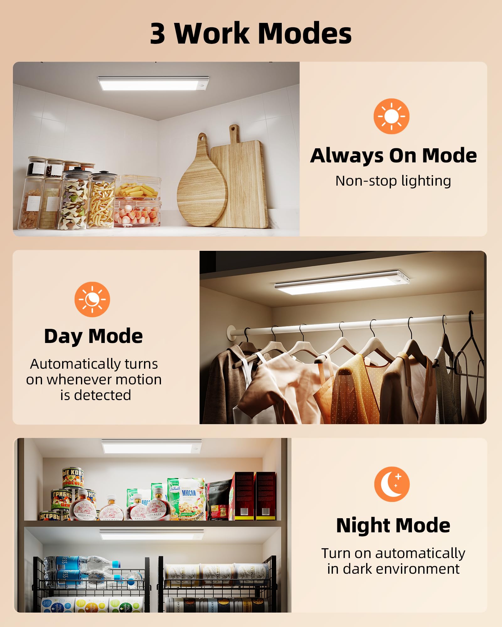- 【Smart Motion Detection & 3 Work Modes】— Our motion sensor lights detect movement up to 10 feet away (120° range). It automatically turns on when you enter the sensing range—no need to hunt for a switch in the dark, and shuts off after 20 seconds of inactivity to conserve energy. You can select from 3 modes: ① Always On Mode for steady light, ② Day Mode that wakes up with any motion, ③ Night Mode that only activates in darkness with motion detection, energy-efficient safety.