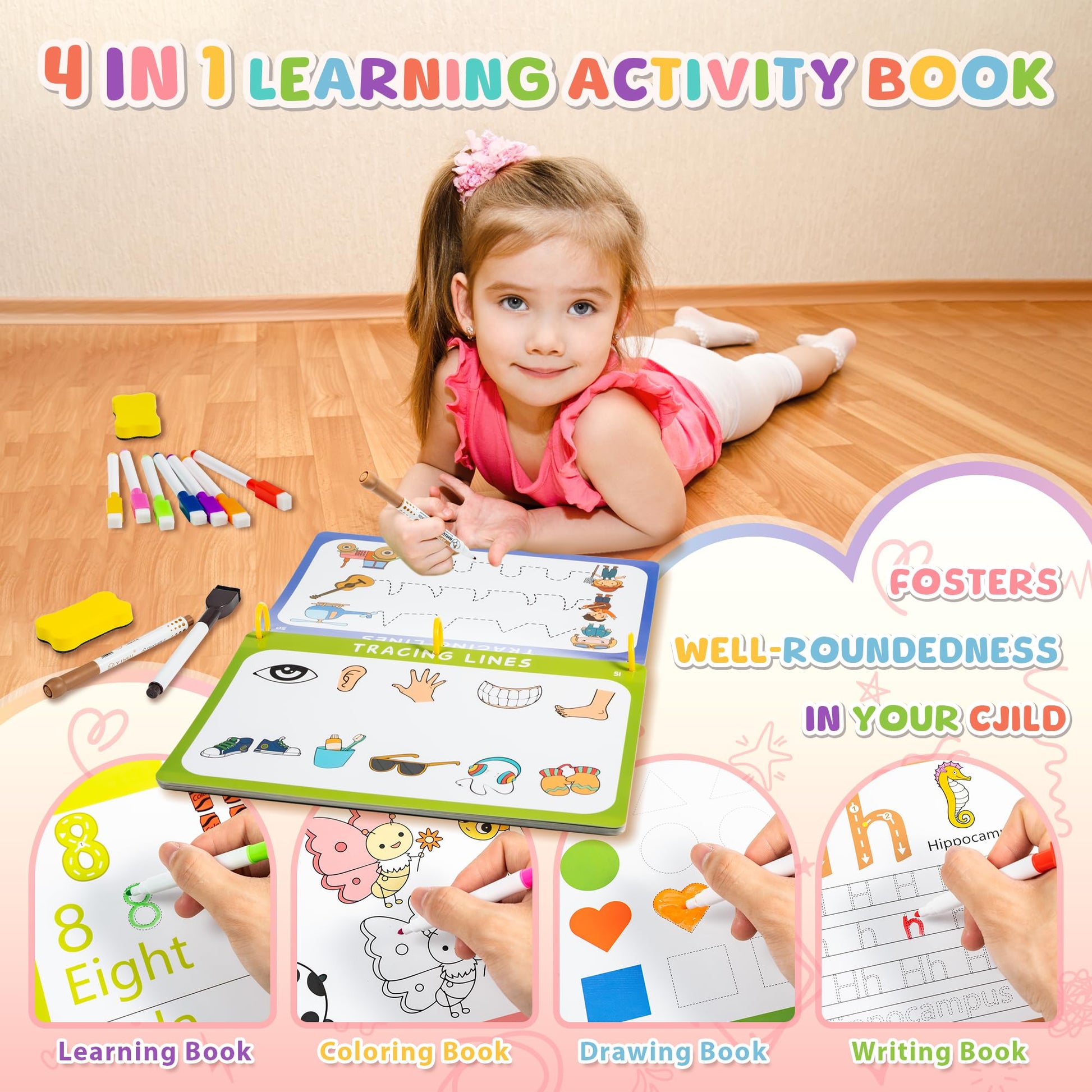 - Premium Quality for Safe Learning: Our workbook is meticulously crafted from thick, high-quality cardboard, ensuring durability and safety for young learners. The smooth, rounded edges of each page prevent any potential injuries, making it perfectly safe for children's daily use. Featuring an erasable and reusable design, this workbook includes 10 vibrant dry-erase markers and 2 erasers, enabling effortless practice and correction. Ideal for toddlers aged 2-4, it offers a toxin-free, odorless environment that parents can trust.