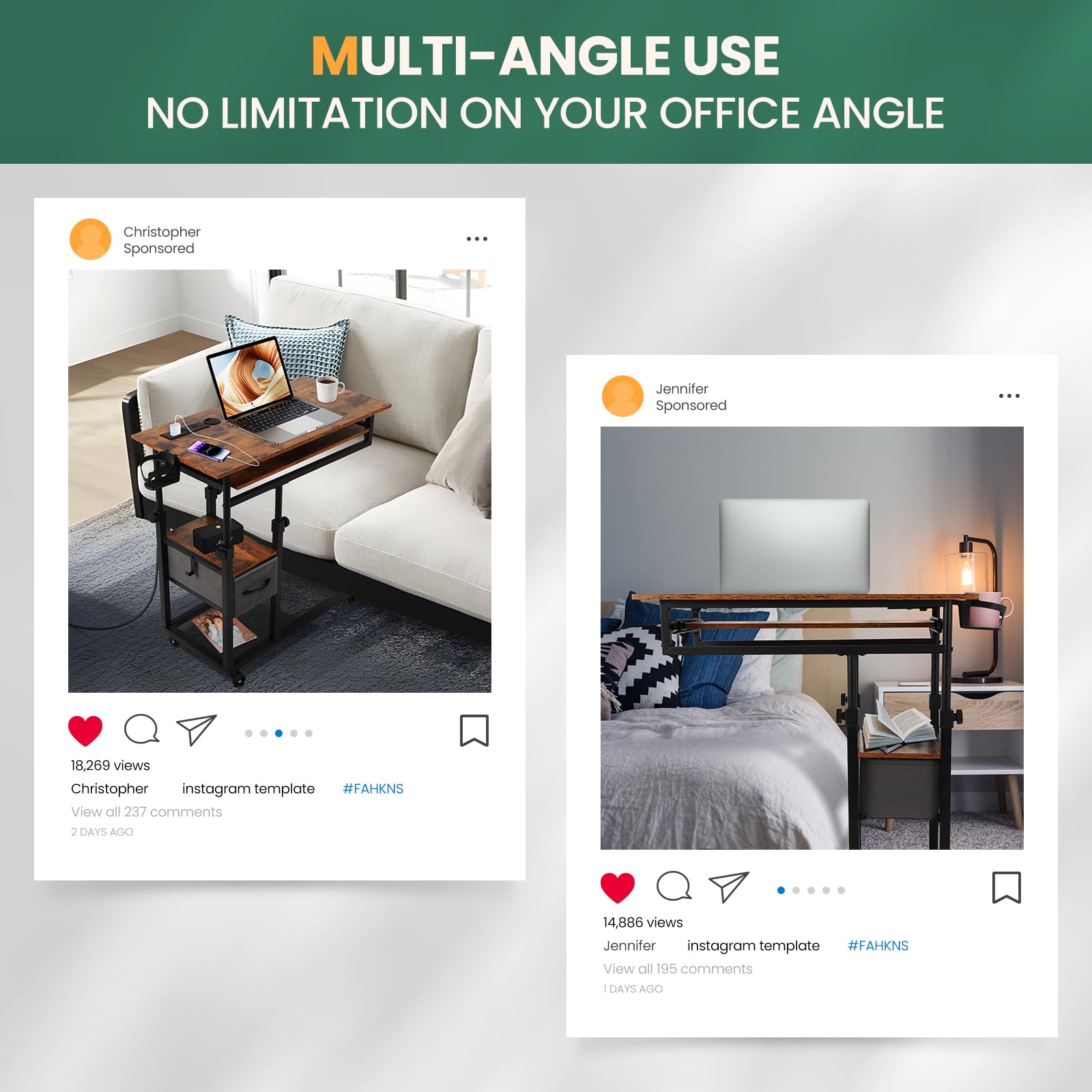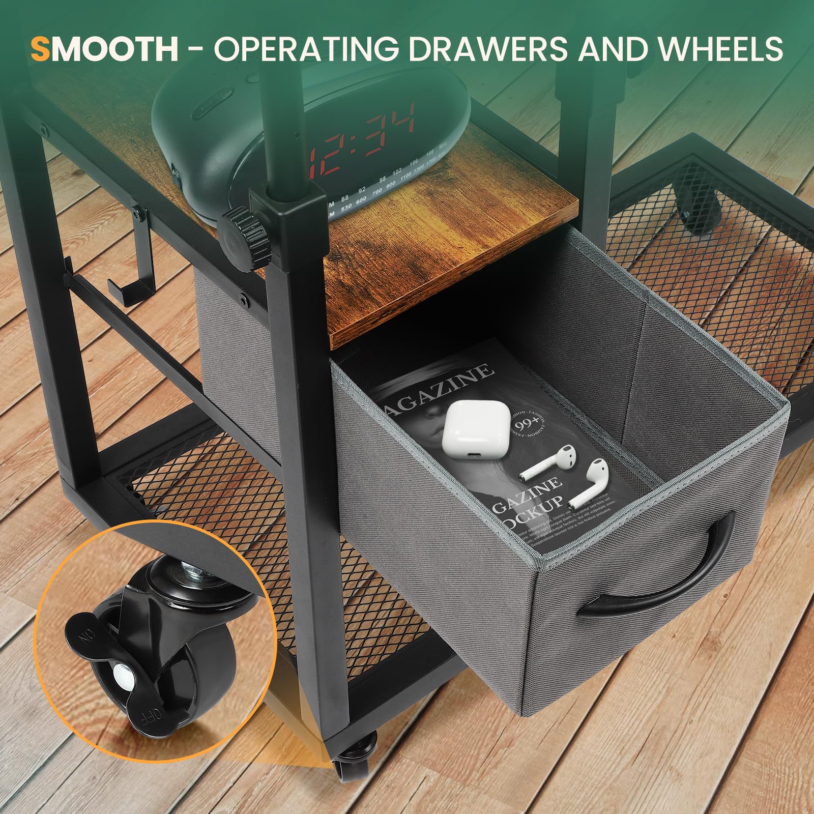 FAHKNS C Desk on Wheels, Height Adjustable Overbed Desk with Charging Station, Couch with Cup Holder, Hook, Drawers, C Shaped End Table for Couch, Over Bed, Living Room