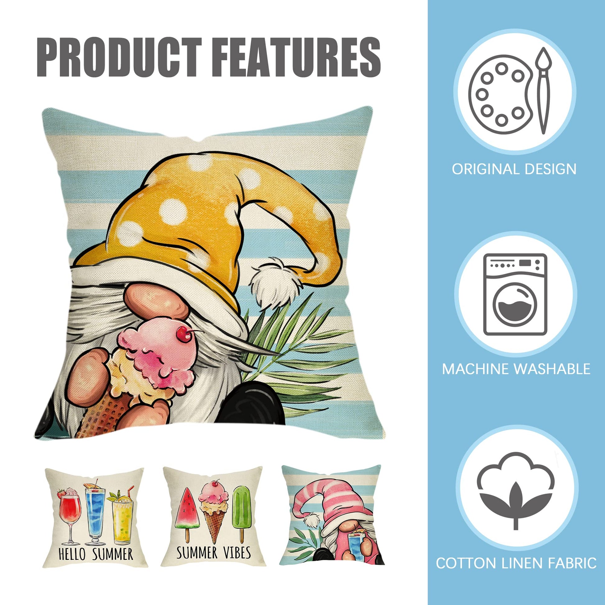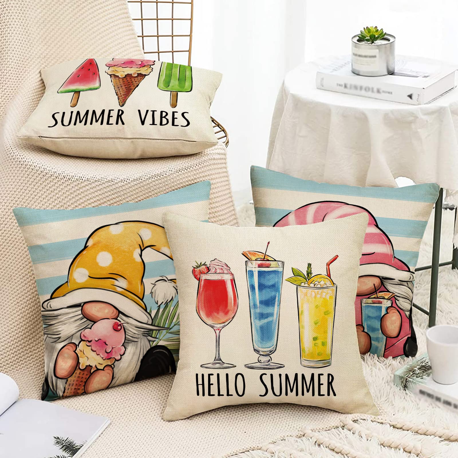 Fahrendom Hello Summer Vibes Gnome Decorative Throw Pillow Cover 18 x 18 Set of 4, Ice Cream Popsicle Juice Porch Patio Outdoor Pillowcase, Stripes Seasonal Farmhouse Couch Cushion Case Home Decor