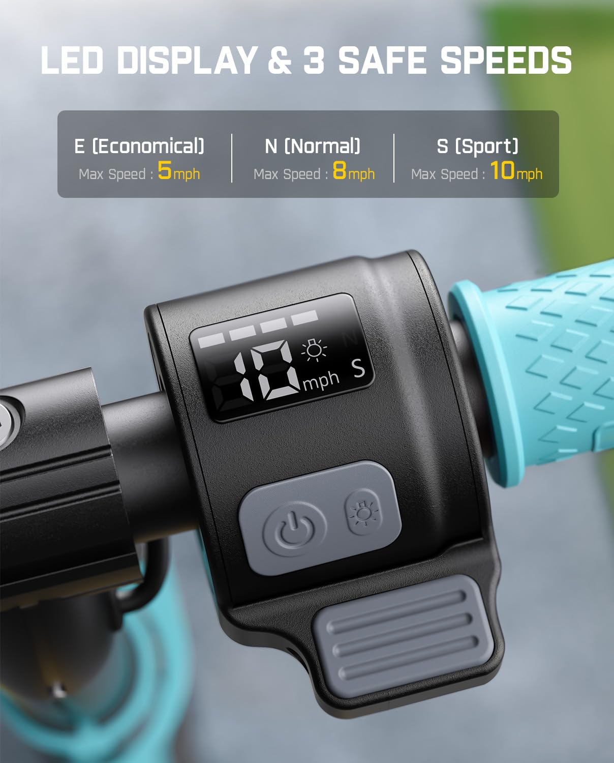 - Versatile Speed & Battery Display: The electric scooter for kids offers three speeds(5 mph/ 8 mph/ 10 mph) selections that are very suitable for children. The LED display shows the battery power, pedal mode, and riding speed at any time
