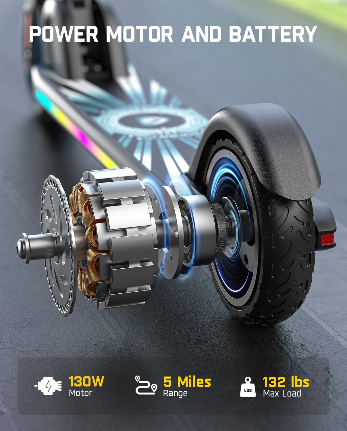 - Bluetooth Music Speaker & 6 Lights Modes: The kids' electric scooter has a Bluetooth music speaker that plays music while riding. It features rainbow lights with 6 modes that sync to the music, attracting attention and improving safety during night rides