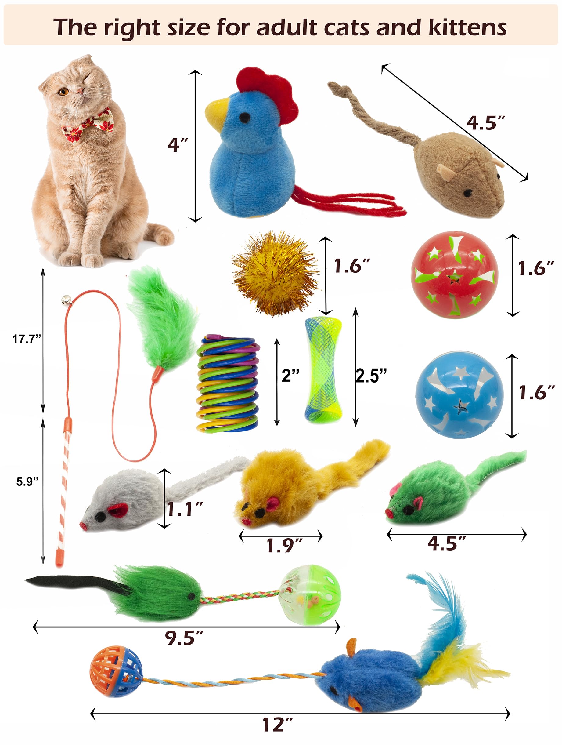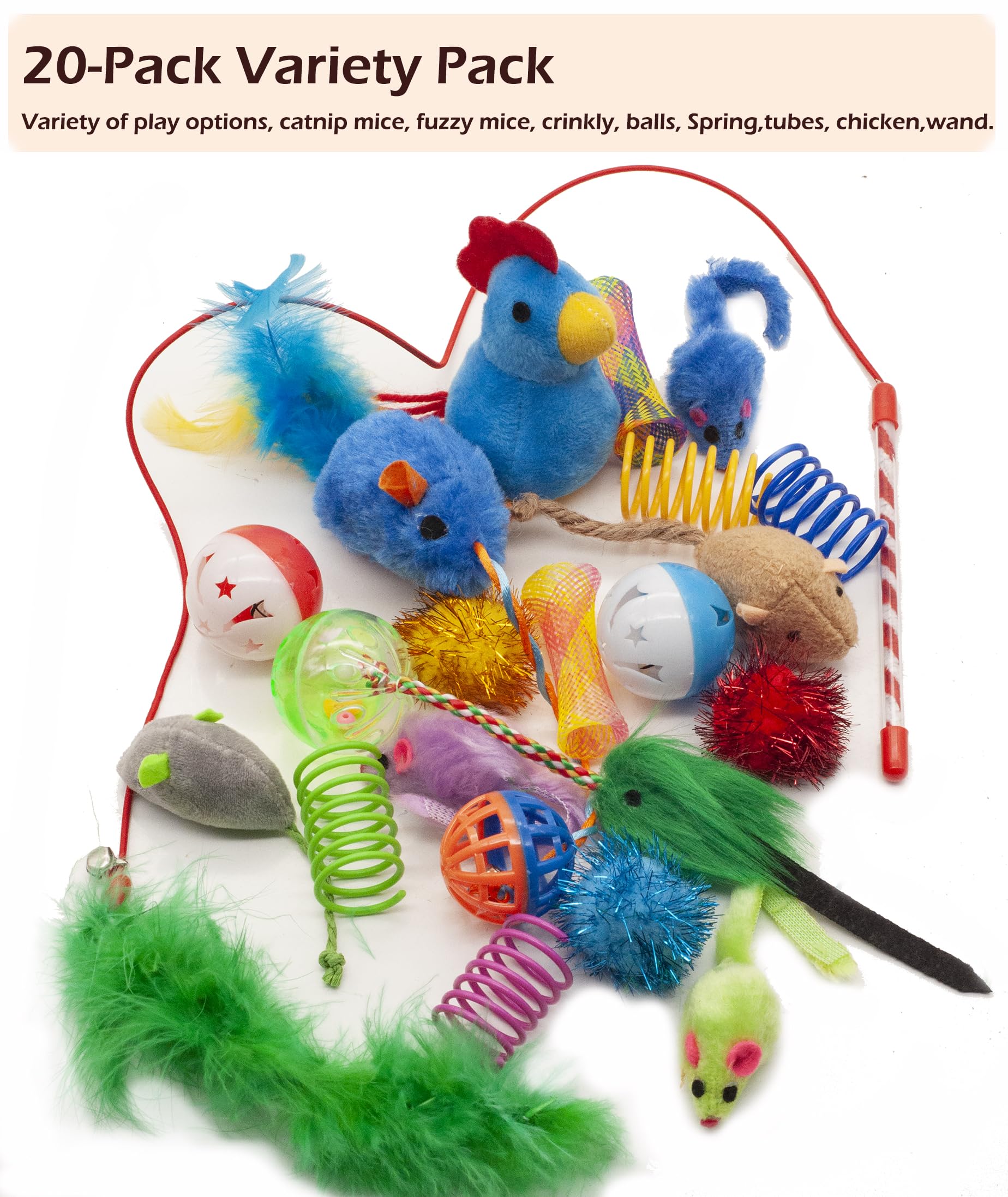 - Multi-Toy Variety: Realistic furry mouse toys , catnip mice, plastic rolling balls toys to feather wand, fuzzy mice with ball, pom-poms, rattling chicken, cat spring, mesh tubes, our pack covers the spectrum of cat play preferences.