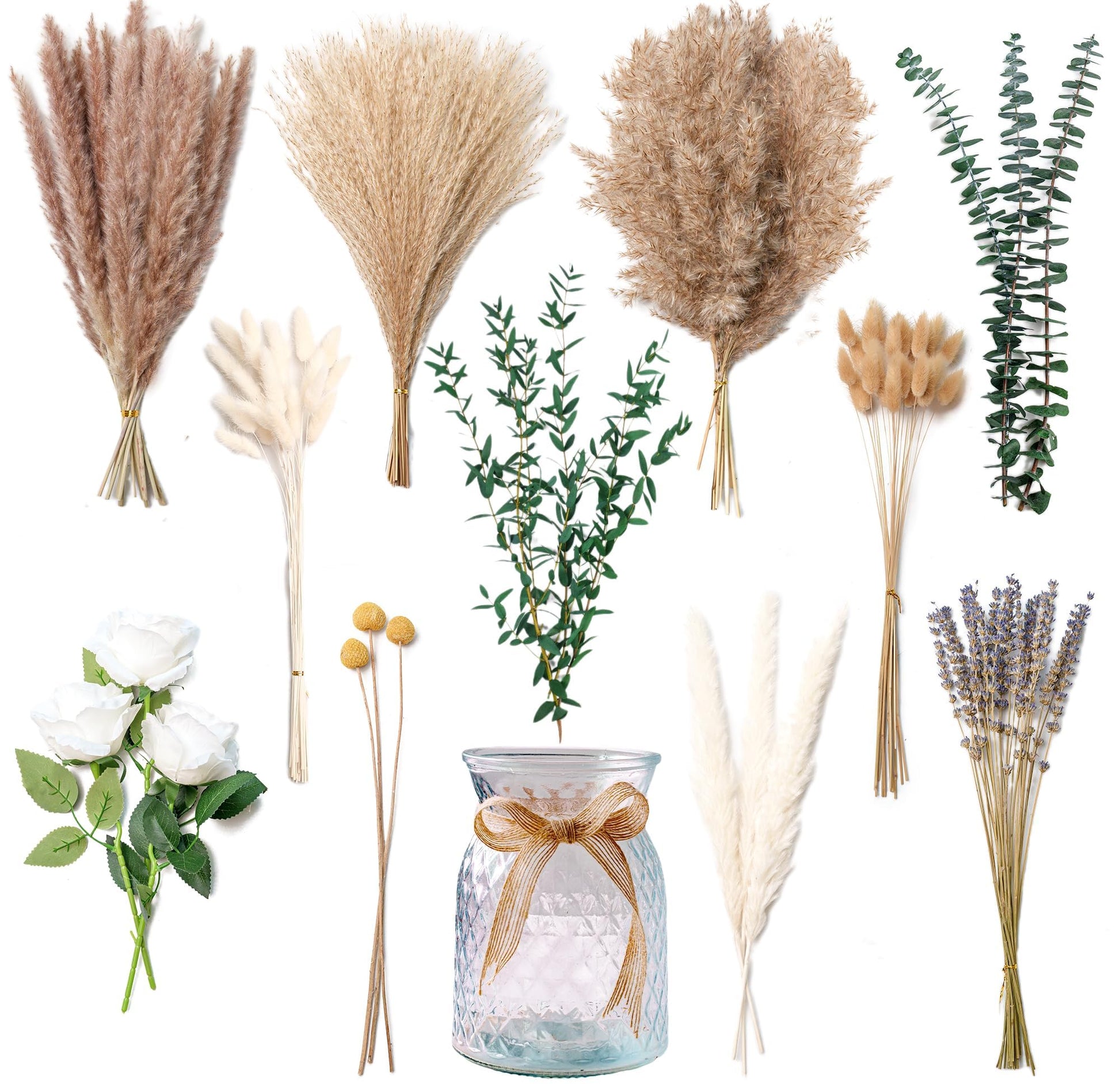 - 🌿 Elegant Artificial Floral Arrangement with Vase: Enhance your dining experience with this stunning artificial flower arrangement in a glass vase. Designed as a perfect centerpiece, this bouquet features a mix of dried pampas grass, fluffy bunny tails, eucalyptus, ruscus, billy buttons, artificial roses, pampas reed, apple leaves, and Lavender. Ideal for table décor in any space, from dining rooms to living rooms.