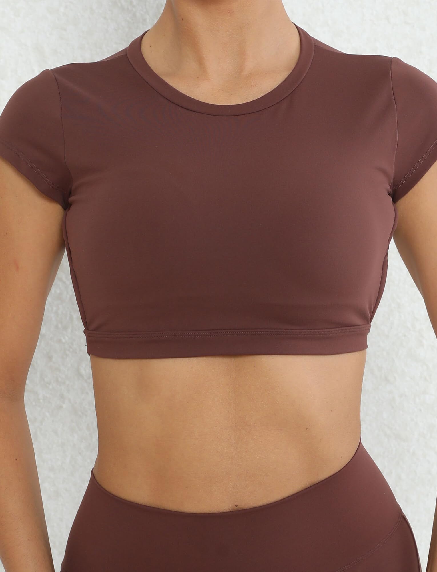 FEOYA Women’s Backless Workout Tops Short Sleeve Round Neck Crop Top Soft Elastic Yoga Fitness Outfits Brown M