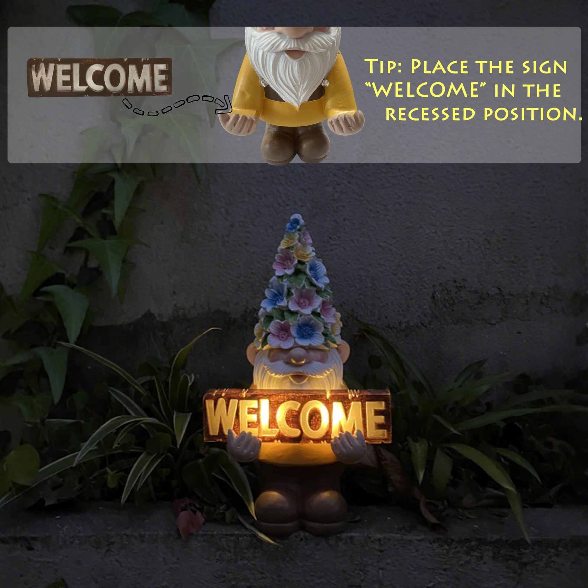 - Adorable Gnome: The garden gnome statue is designed into the shape of a yellow gnome with a white beard, brown boots, holding a movable and glowing 'WELCOME' sign, adding a whimsical and welcoming touch to your garden