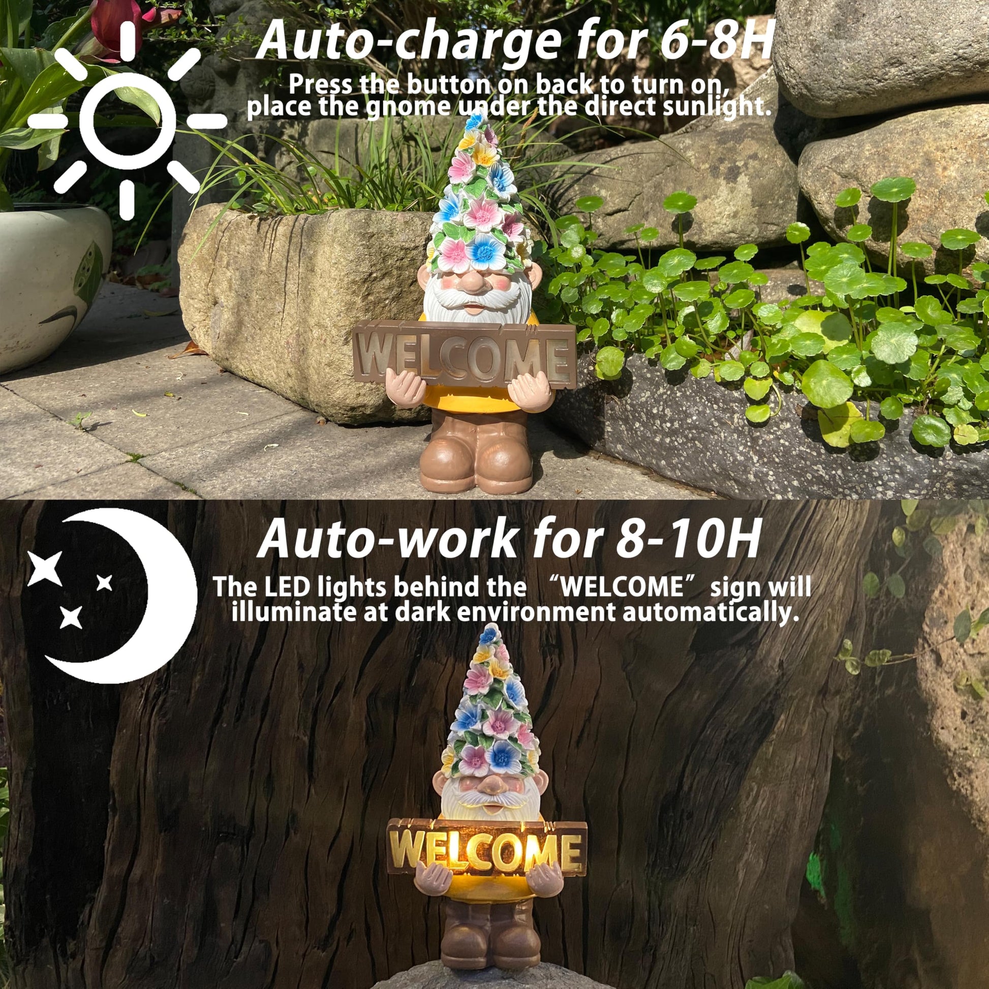 - Solar Powered: The outdoor gnome is equipped with solar panel on its back, which will charge during the day and illuminate the LED lights on gnome’s arms at night, creating a magical glow. Please make sure to turn on the switch before use, and place the resin gnome under the direct sunlight to get sufficient energy during day time