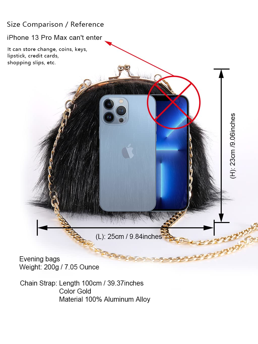- DIMENSION/SIZE: Evening Bag Size: (L)9.8inches x (W)2inches x (H)9.06 inches /OR/ (L)25cm x (W)10cm x (H)23cm. Product Weight: 200g / 7.05 Ounce. [※Small size - iPhone 15Pro Can enter; But iPhone 15Pro Max Catn't enter]