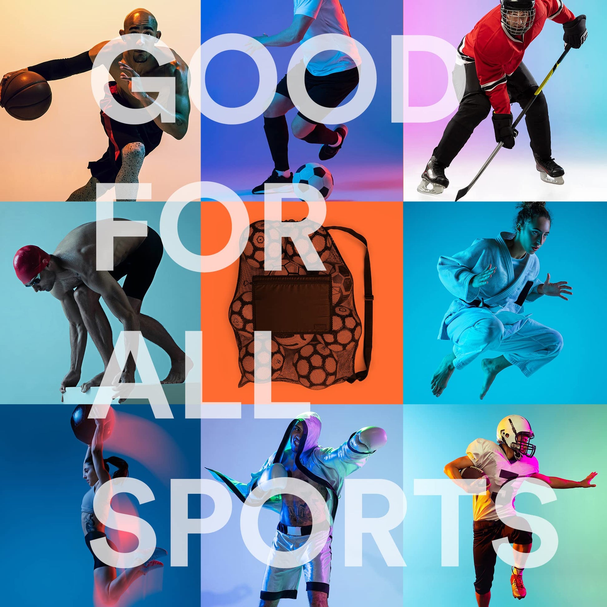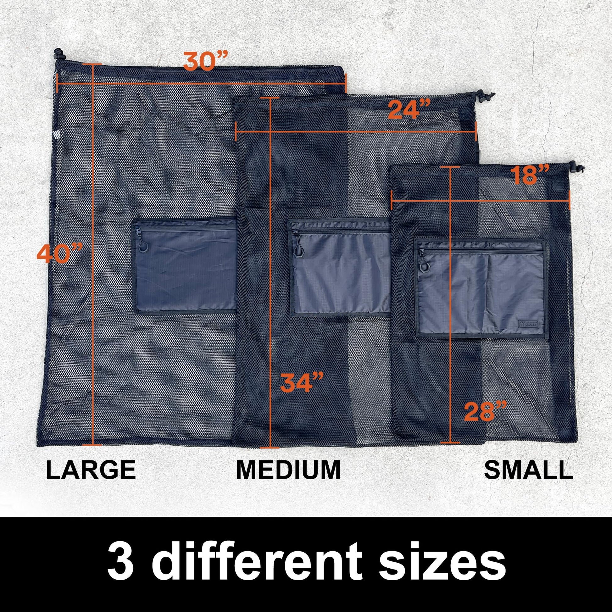 - Jumbo to small elastic mesh bag for all your sporting needs - Measuring at 40x30 inches for large size, 34x24 inches for medium size, 28x18 inches for small size, it's designed to hold team jerseys, soccer balls,football, volleyball and even water sports equipment. It is the ultimate bag for all your sports and outdoor activities.