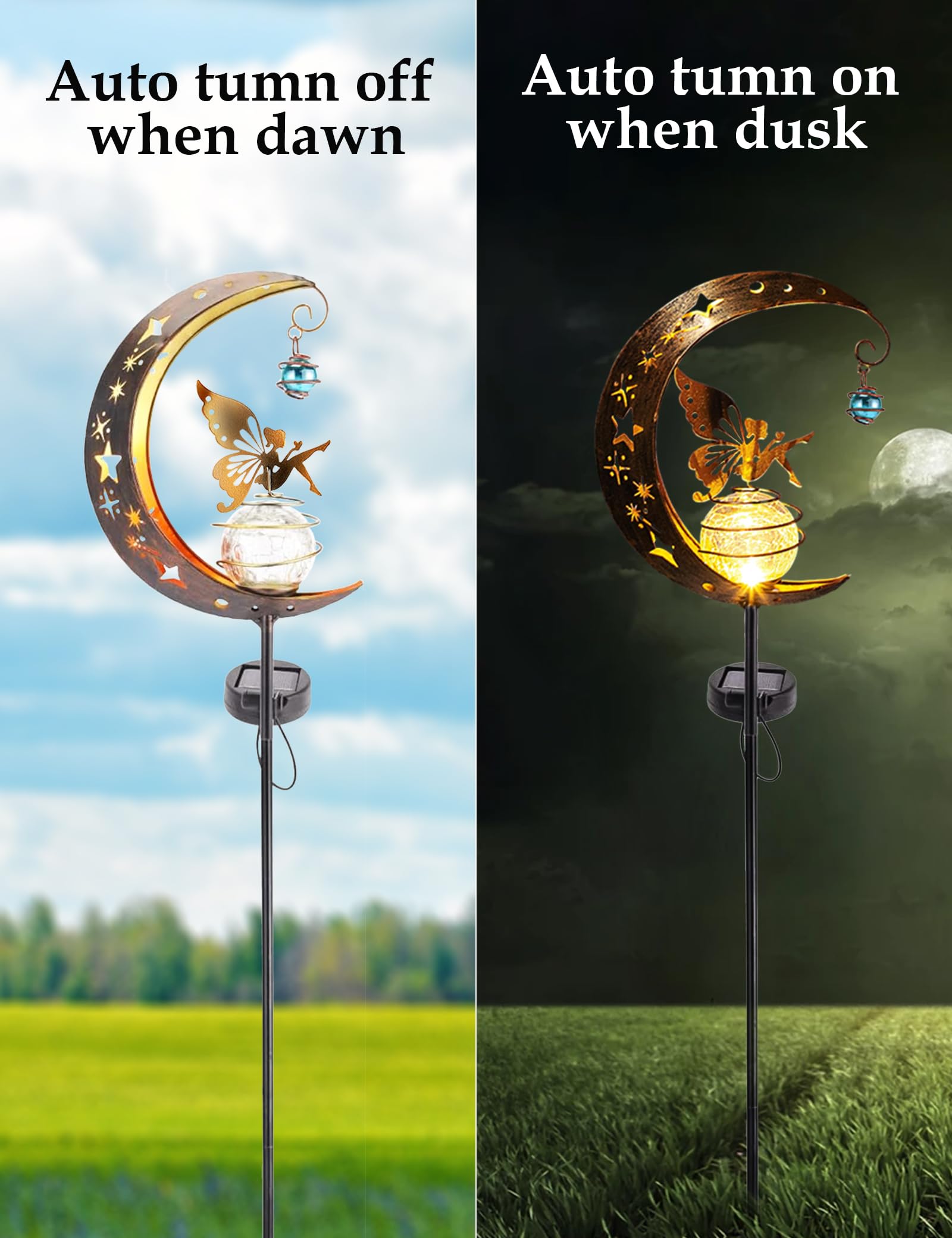 FKKsparkler Solar Powered Garden Decor Lights Moon Fairy Crackle Glass Globe with Gold Angel Decor Waterproof Stake Lights for Pathway, Yard, Lawn, Patio Outdoor Decor Garden Gifts Decoration