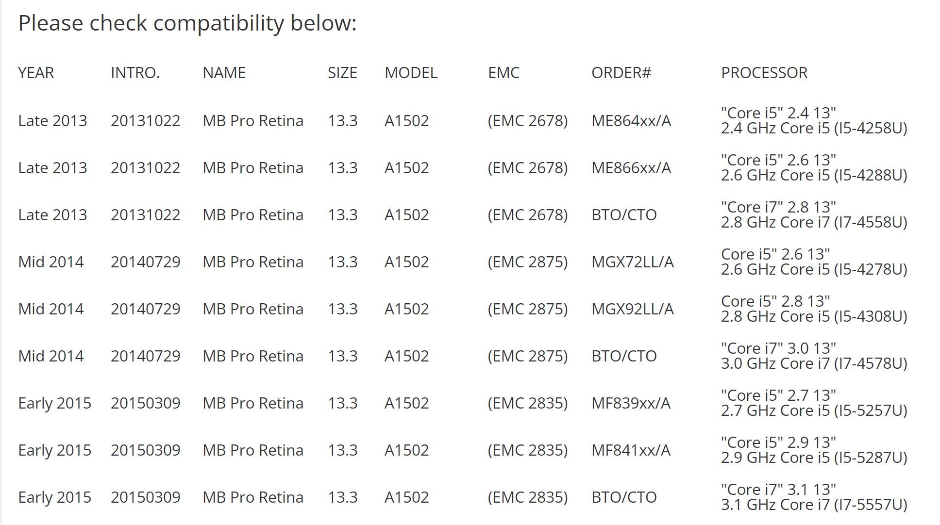 Details: Compatible Model:for MacBook Pro 13' Retina A1502 2013 2014 2015