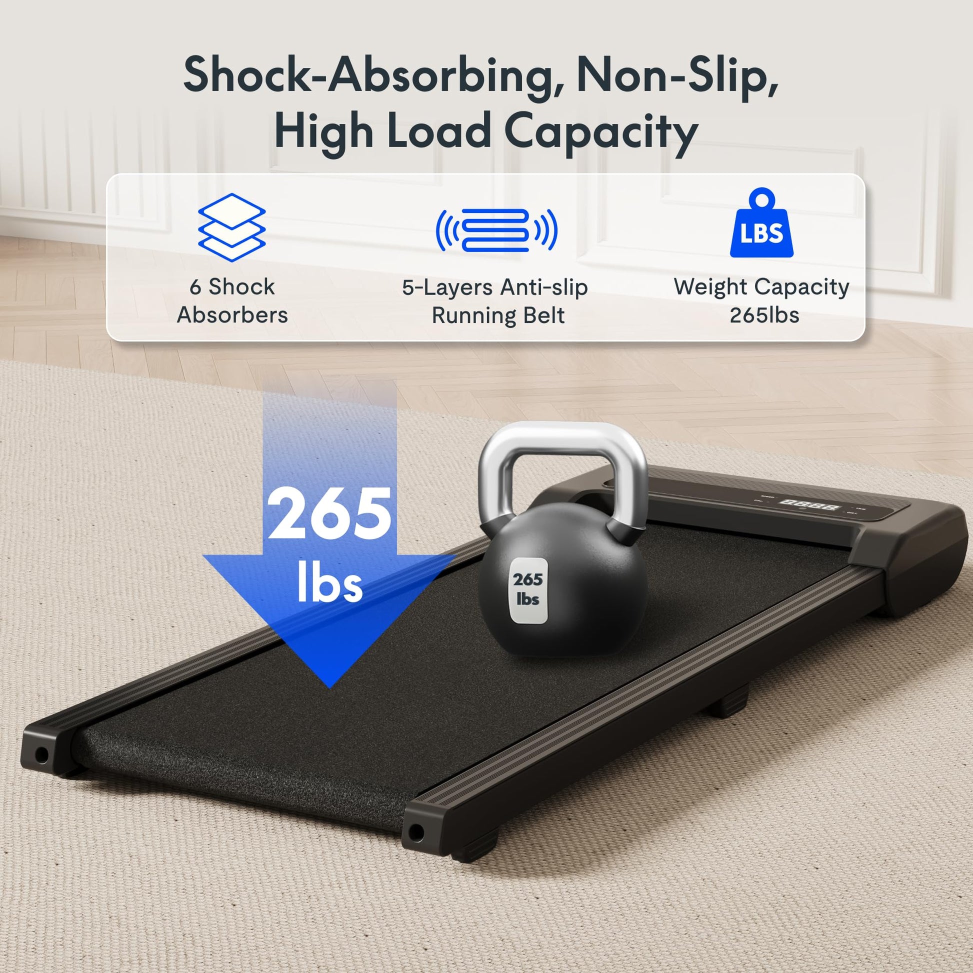 - BUILT FOR STABILITY & STRENGTH: Crafted with a reinforced steel frame and anti-slip belt, this treadmill supports users up to 265 lbs. The 6-point shock absorption system reduces joint impact for safer, more comfortable use.