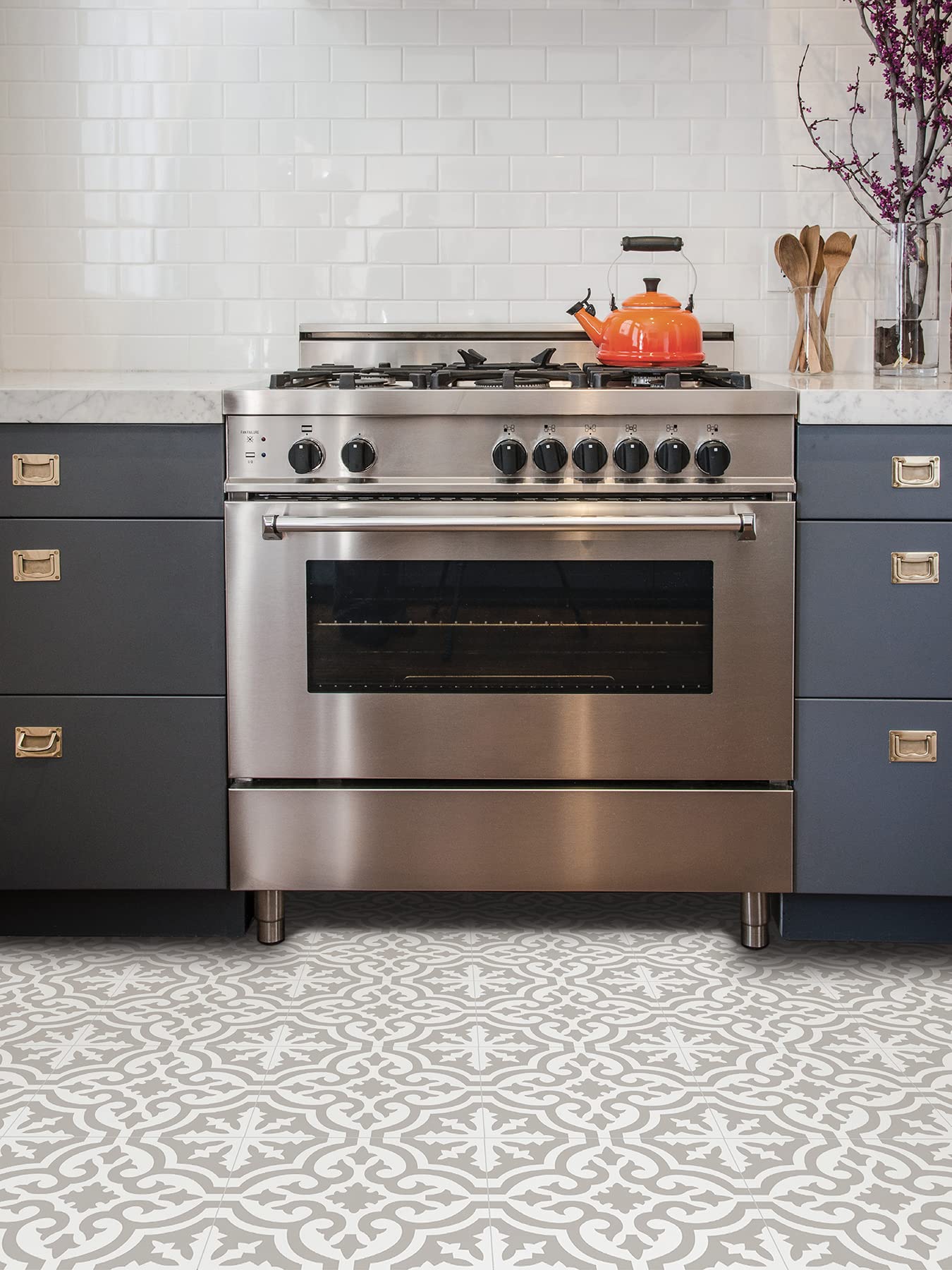 Details: Perfect for the modern farmhouse, these taupe peel and stick floor tiles are a simple way to transform the look of dated floors. The warm undertones in this intricate ironwork design have an understated elegance. Emilia Peel and Stick Floor Tiles contains 10 pieces on 10 sheets that measure 12 x 12 inches. This product measures 60-in x 24-in when assembled.