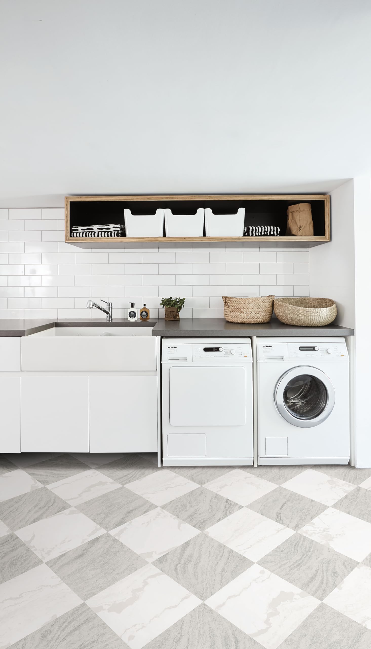 - Virgin Vinyl material with a textured low lustre finish and permanent adhesive makes tiles durable