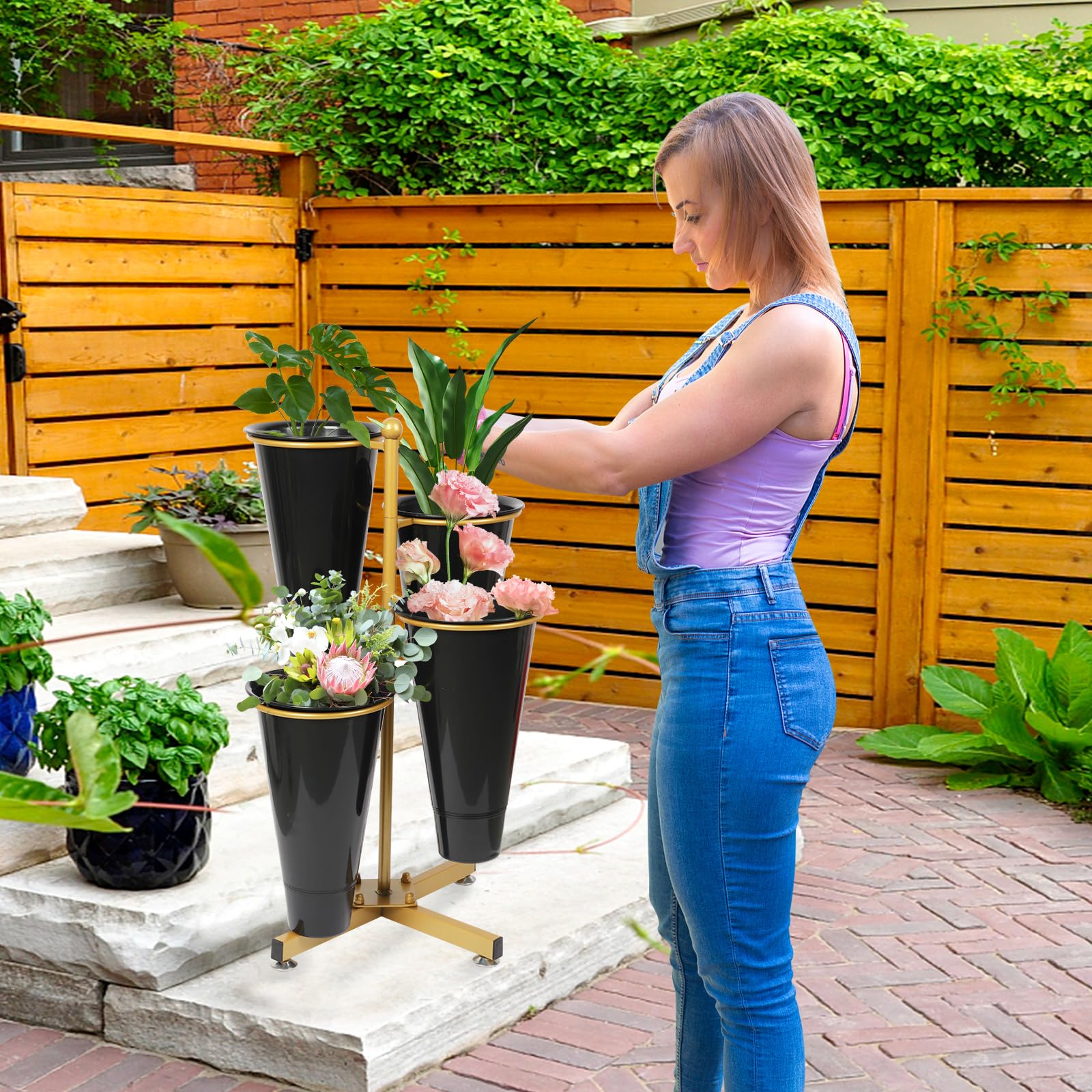 - 【Multi-function Floral Stand】- The garden floral stand Equipped with 4 flower buckets, Soil and water can be placed, Keep plants and flowers alive for a long time. It is ideal for displaying your flowers and plants in homes, patio, florists, clubs, weddings, and other places.