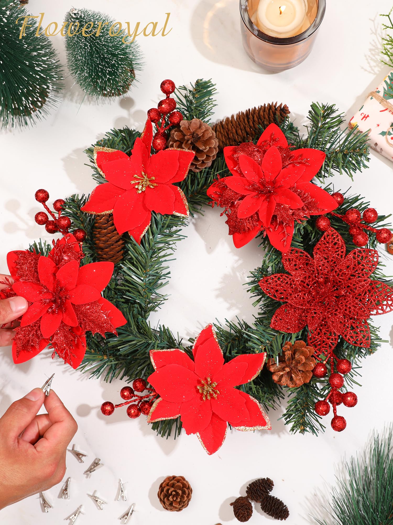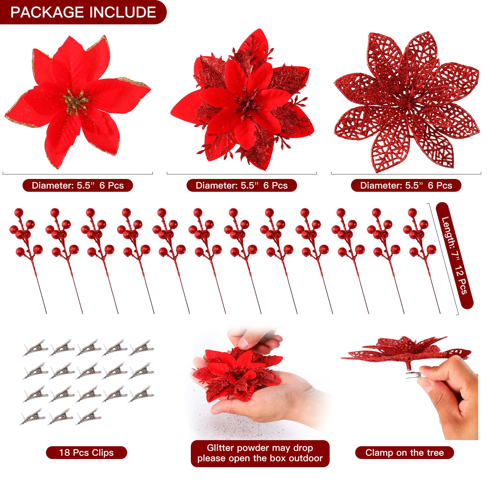 - 3 STYLE POINSETTIA ARTIFICIAL FLOWERS: Floweroyal glittery artificial poinsettia flowers size: approx 5.5 IN-(14 CM). Each package includes 18 pcs poinsettia Christmas flowers, 18 pcs clips and 12 pcs berry stems. Using poinsettias of different textures, along with the addition of berries for decoration, enhances the display, creating a visually striking and festive Christmas showcase that captures the essence of the holiday season