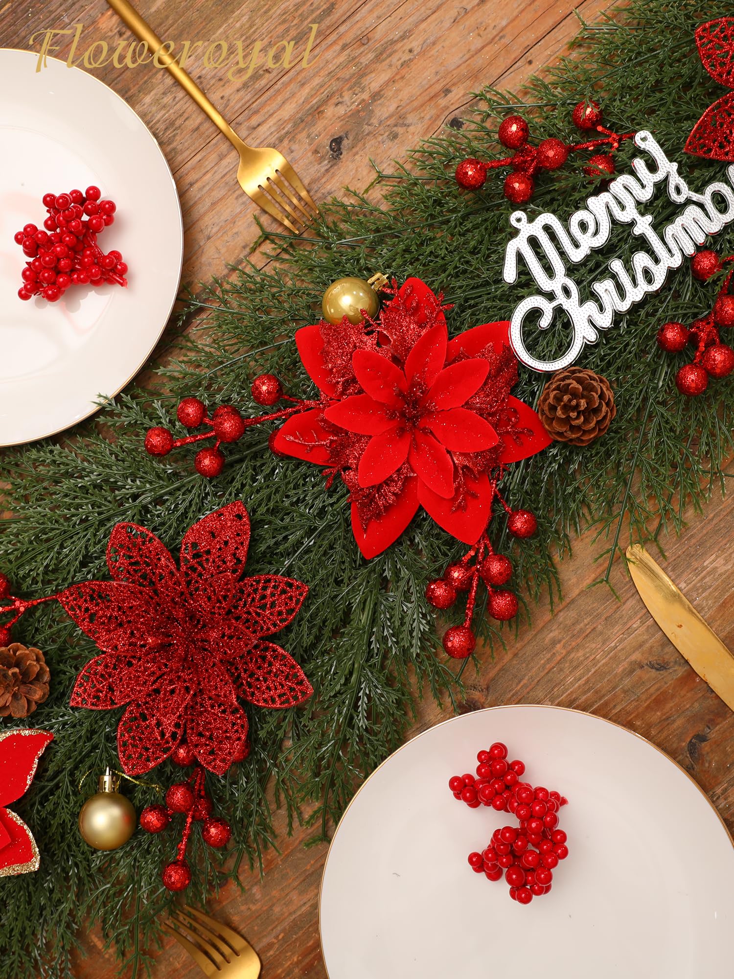 - CHRISTMAS DECORATIONS FOR INDOOR OUTDOOR: Floweroyal poinsettias with berries that are great for Christmas decorations. Not only can craft wreaths adorned with poinsettias to hang on interior doors or walls, also can place poinsettias in outdoor planters or pots to line pathways, decorate porches, or enhance outdoor seating areas. Nice choice for Christmas tree, dining table centerpieces, wreath, garland, fireplace, front door, windowsills, wall, New Year's party, stage decoration