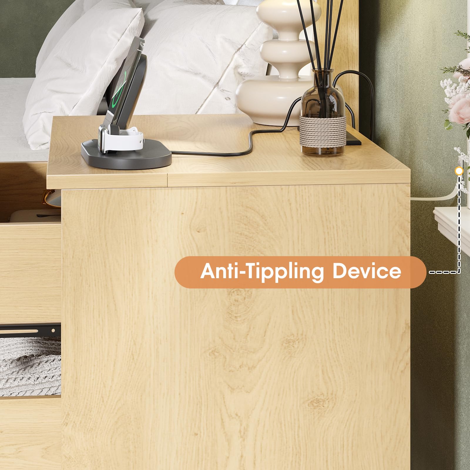 - 【Stable & Sturdy】Maupvit puts your safety first. The nightstand's stability is enhanced by its H-shaped metal base. The table stands firmly on the floor while maintaining clearance underneath for easy clean and moisture building-up. For homes with children or elderly residents, you can secure the end table to the wall using our anti-tipping device to prevent accidents.