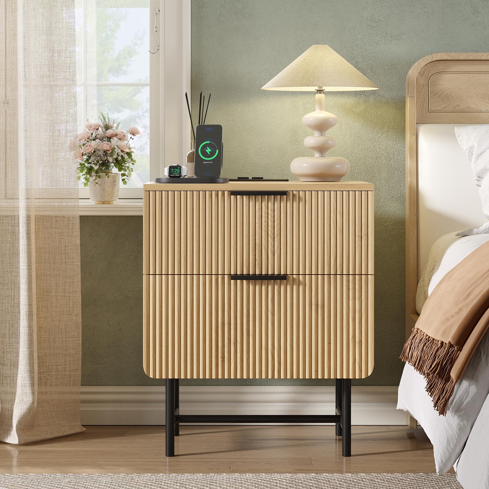 Fluted Nightstand with Charging Station, 20" Modern Bedside Table with 2 Drawers for Bedroom, Mid Century Modern End Table with Storage for Living Room, Natural Oak (1 Piece)