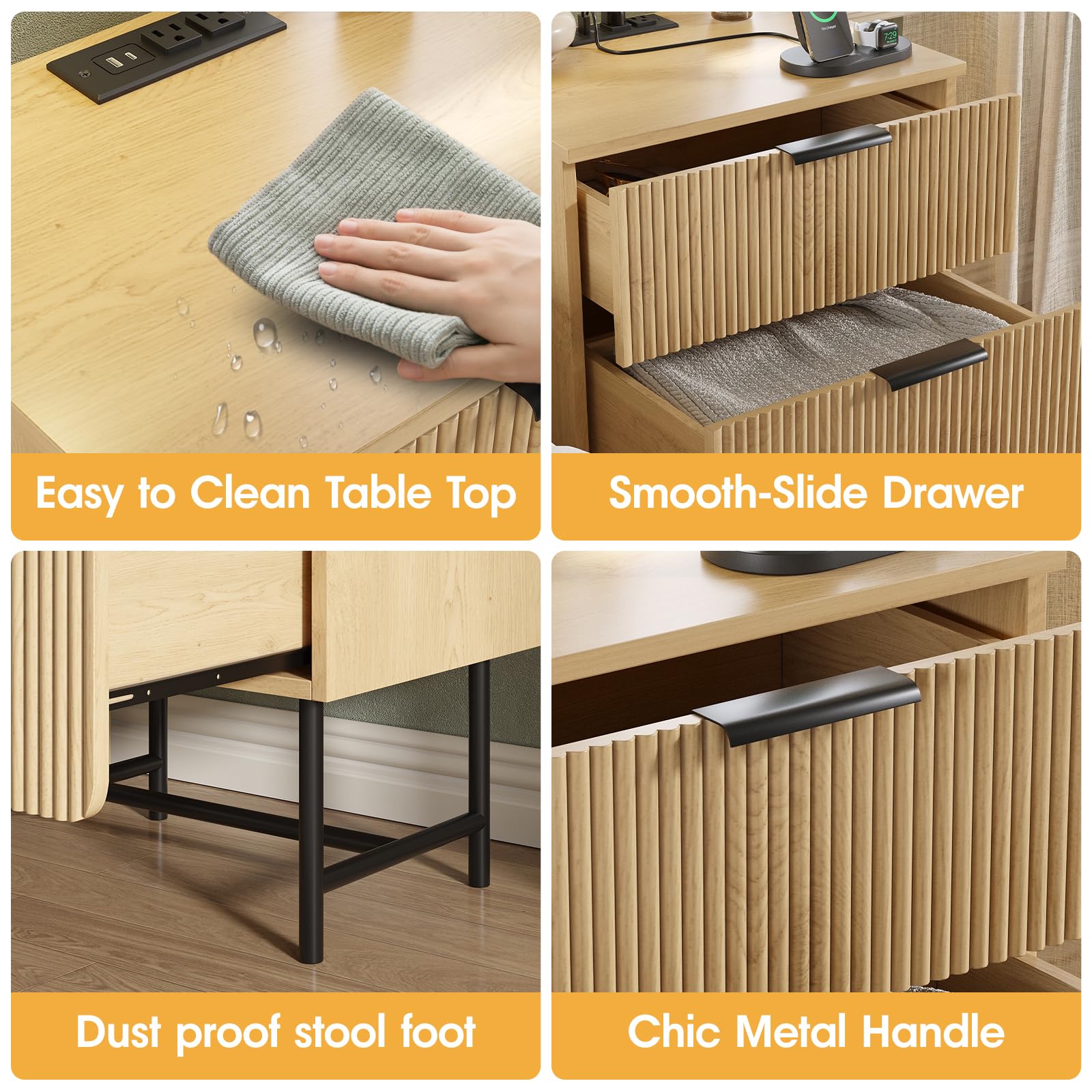 - 【Modern Chic & Vastile Applications】: The bedside table features a flutted pattern that blends modern aesthetics with minimalist design. Its metal handles add elegance and sophistication, while the smooth lines and neutral wood finish create a simple yet generous look, bringing warmth to both bedroom and living room spaces. The night table is not only suitable as a night table in bedroom, an end table in living room, or a side table in office, but serve as a modern room decor.