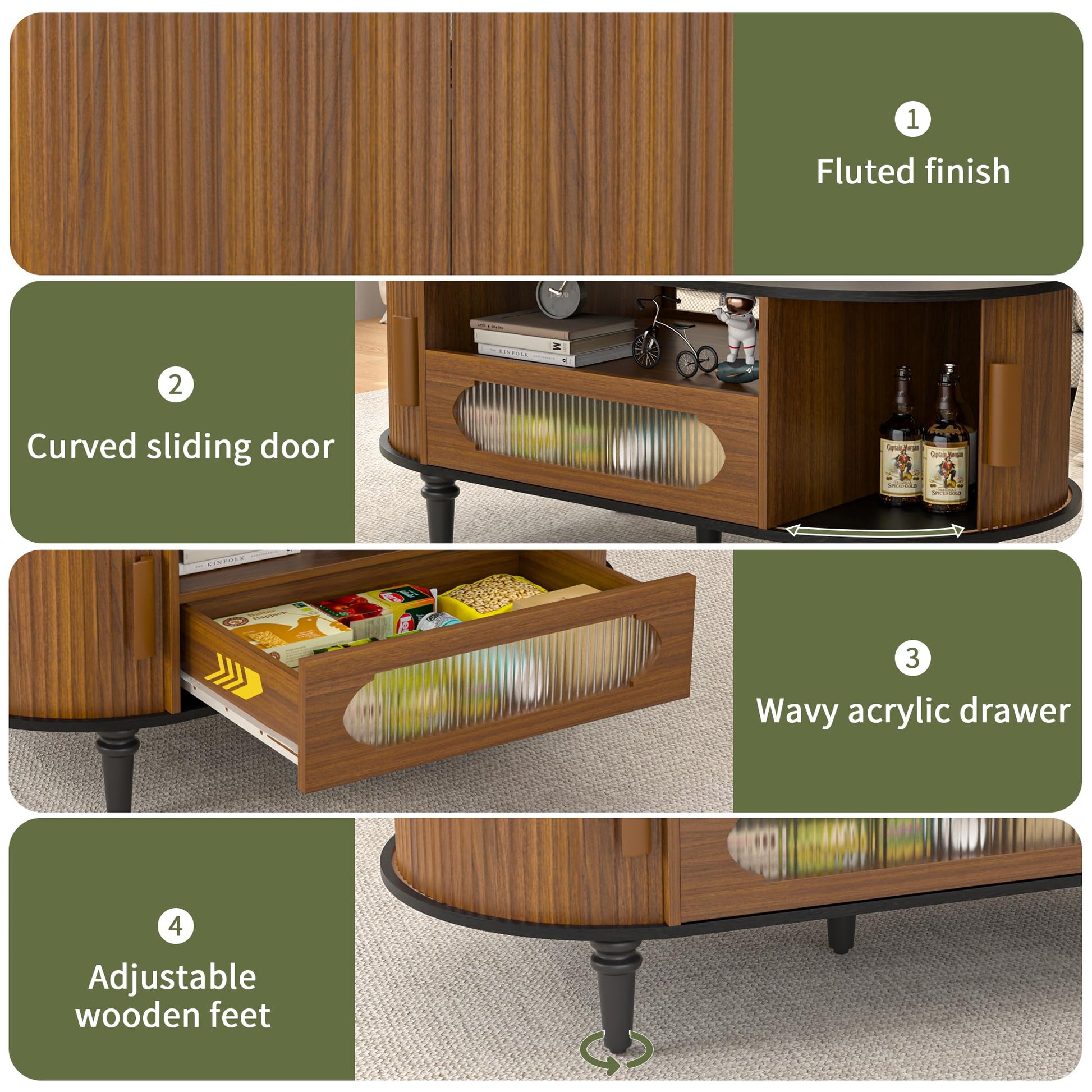 - Mid Century Modern Coffee Table: Elevate your living space with this modern coffee table. With wavy designs on the doors and drawers, curved doors, and five fine wooden feet, the unique oval shape of the coffee table is just the right size. The small center table is perfect for both cozy nooks and spacious areas, enhancing any decor style