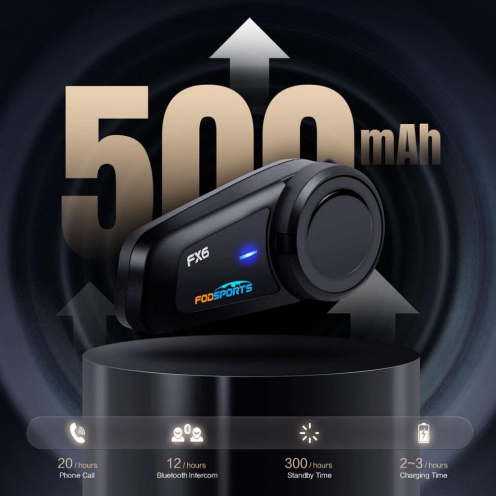 - [ Extended Battery Last the Whole Ride] FX6 motorcycle helmet intercom system will takes 10 hours stream music, talking to teammates before running out of battery with 3 hours single charge, approximately 150 songs. 2 ports feature allow you to charge the motorcycle intercom with power bank on road trip. Ride and charge the motorcycle headset pair, needn't compromise on the go.