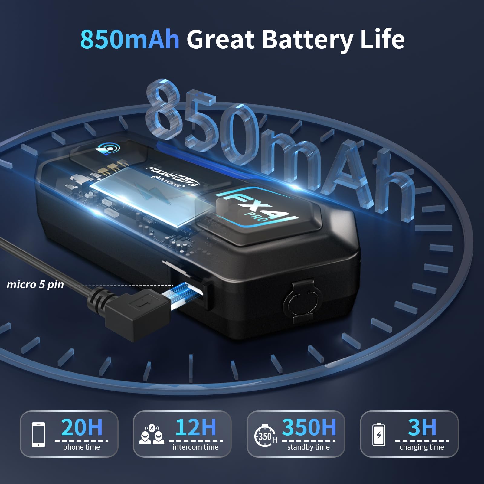 - 【Long Battery Life & Easy to use and install】The FX4 Pro motorcycle helmet intercom system come with 850mah Battery support up to 20 hours of phone time, up to 12 hours of intercom time, and up to 350 hours of standby time with 3 hours single charge, Easy setup to detachable boom microphone and button microphone for full face/ modular flip up/ 3/4 open face helmet. It's perfect for daily commute/ long road trip.