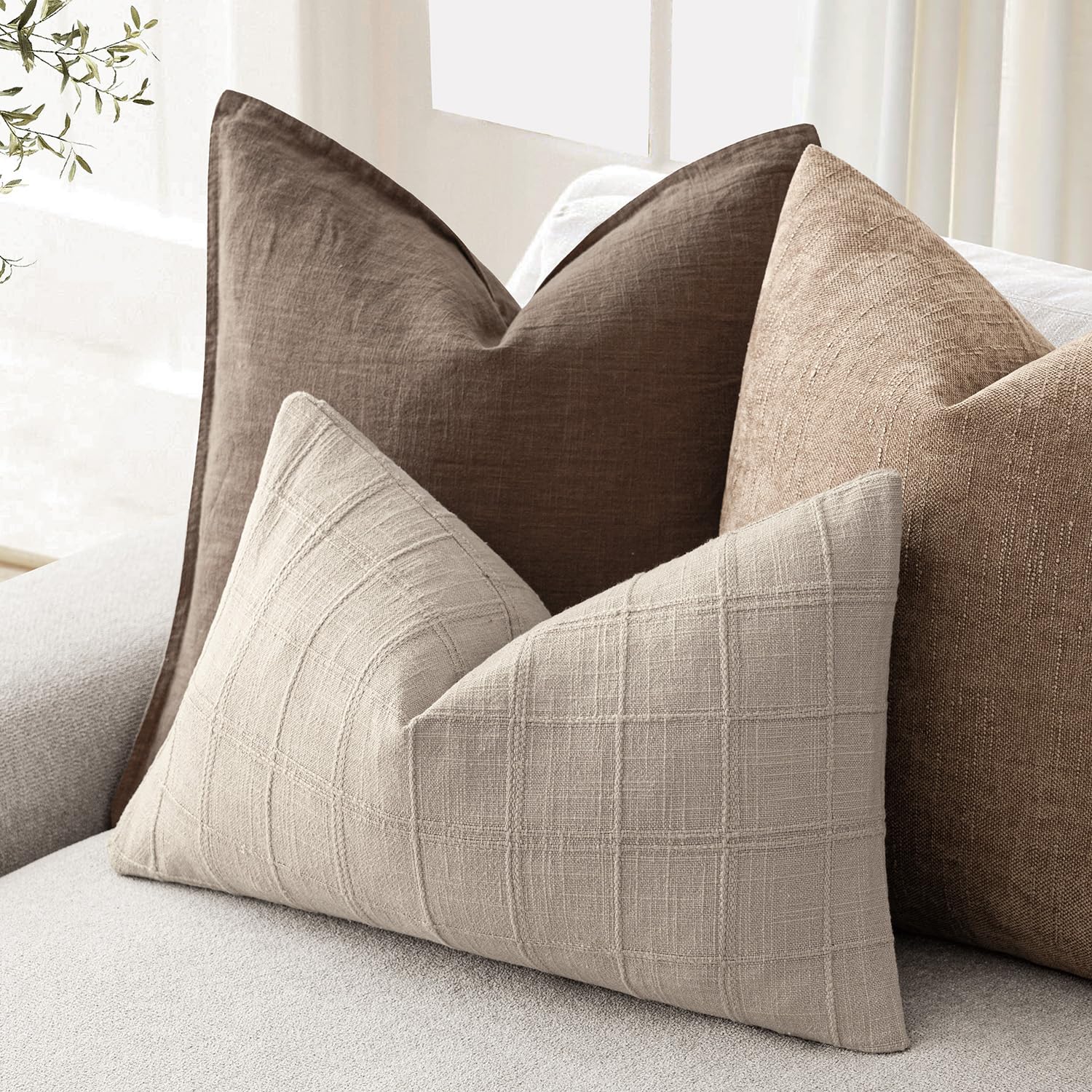 Foindtower Set of 2 Decorative Linen Check Throw Pillow Covers Neutral Farmhouse Lumbar Cushion Covers Modern Boho Home Decor for Sofa Chair Couch Bedroom Living Room Outdoor,12×20 Inch,Natural Linen