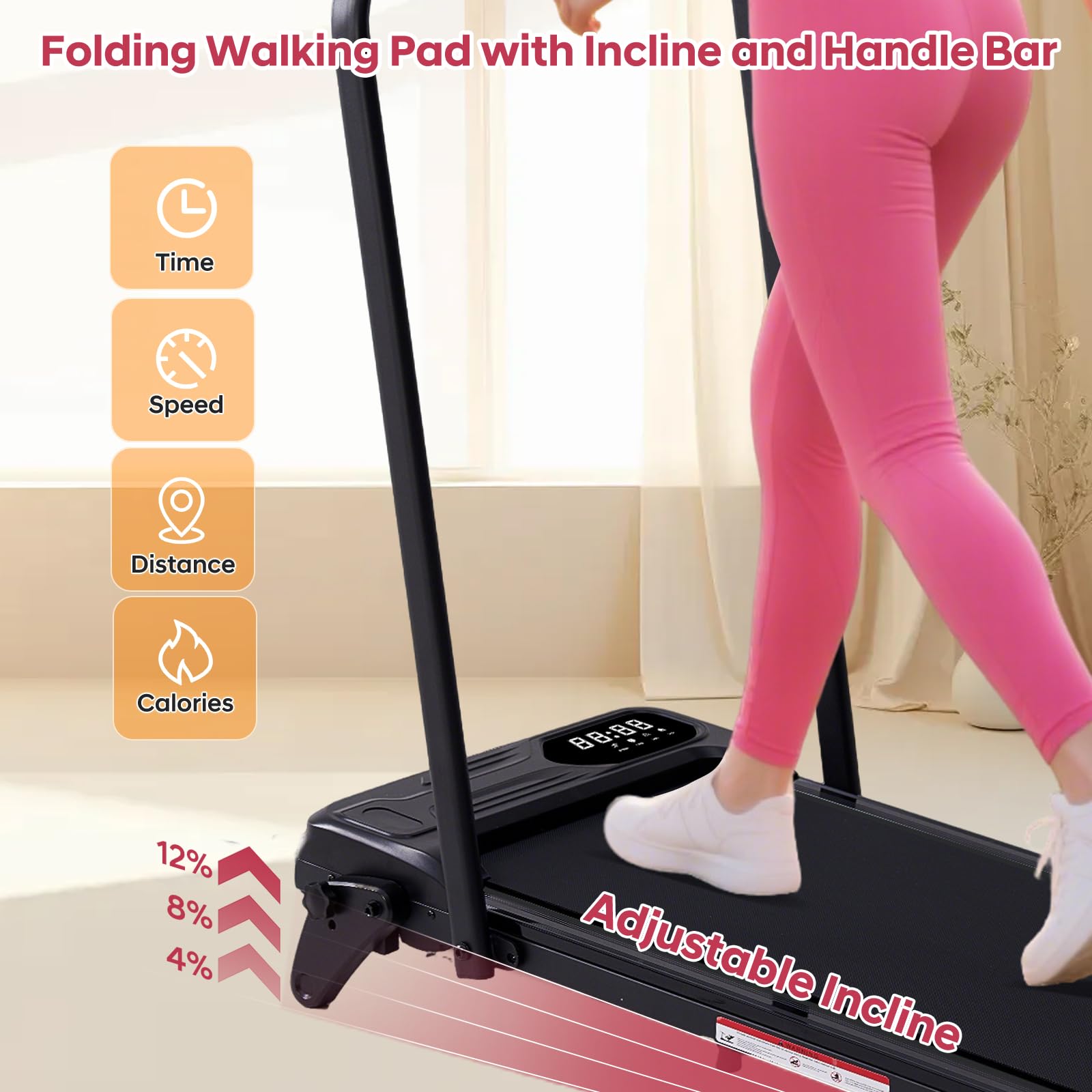 - 【3-Level Incline Walking Pad Treadmill with Handles】 Elevate your walk, torch more calories—this portable walking pad treadmill with handle bar features 3 manual slope settings (0-12%), letting you dial up intensity like real hills. Sturdy anti-slip handlebars keep you steady, while incline mode burns 4-5x more calories than flat walks—enough to melt 4-5 whole 8-inch pizzas per session