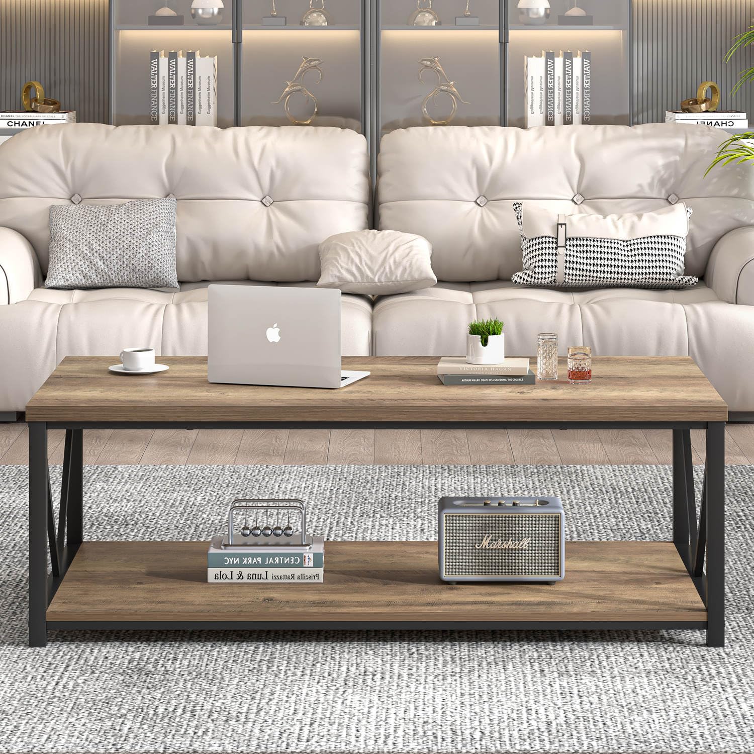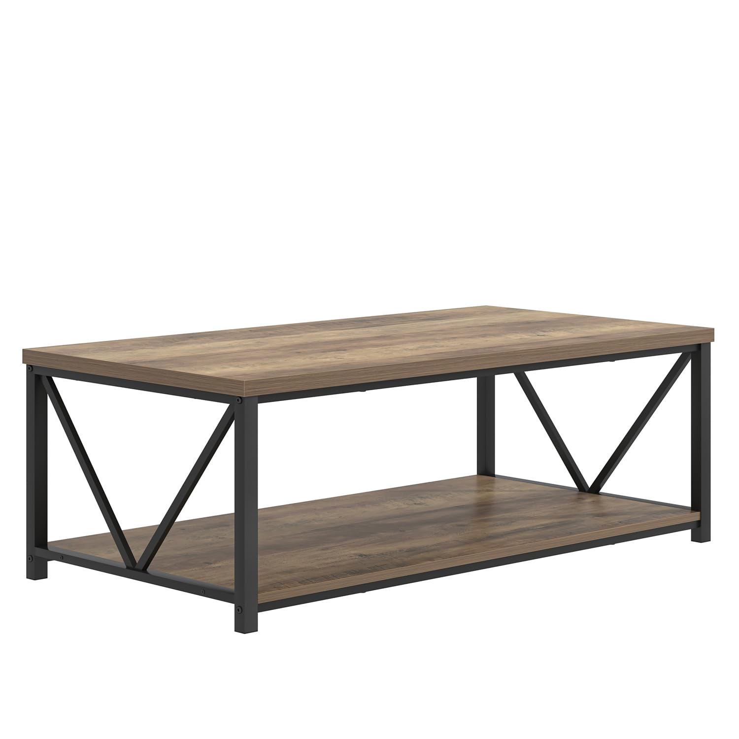 - Rustic Coffee Table: Featuring a modern oak wood grain finish and black V-shaped metal side frames, this modern coffee tables for living room perfectly blend vintage charm with contemporary and industrial design elements, making it a nice centerpiece for any stylish space.