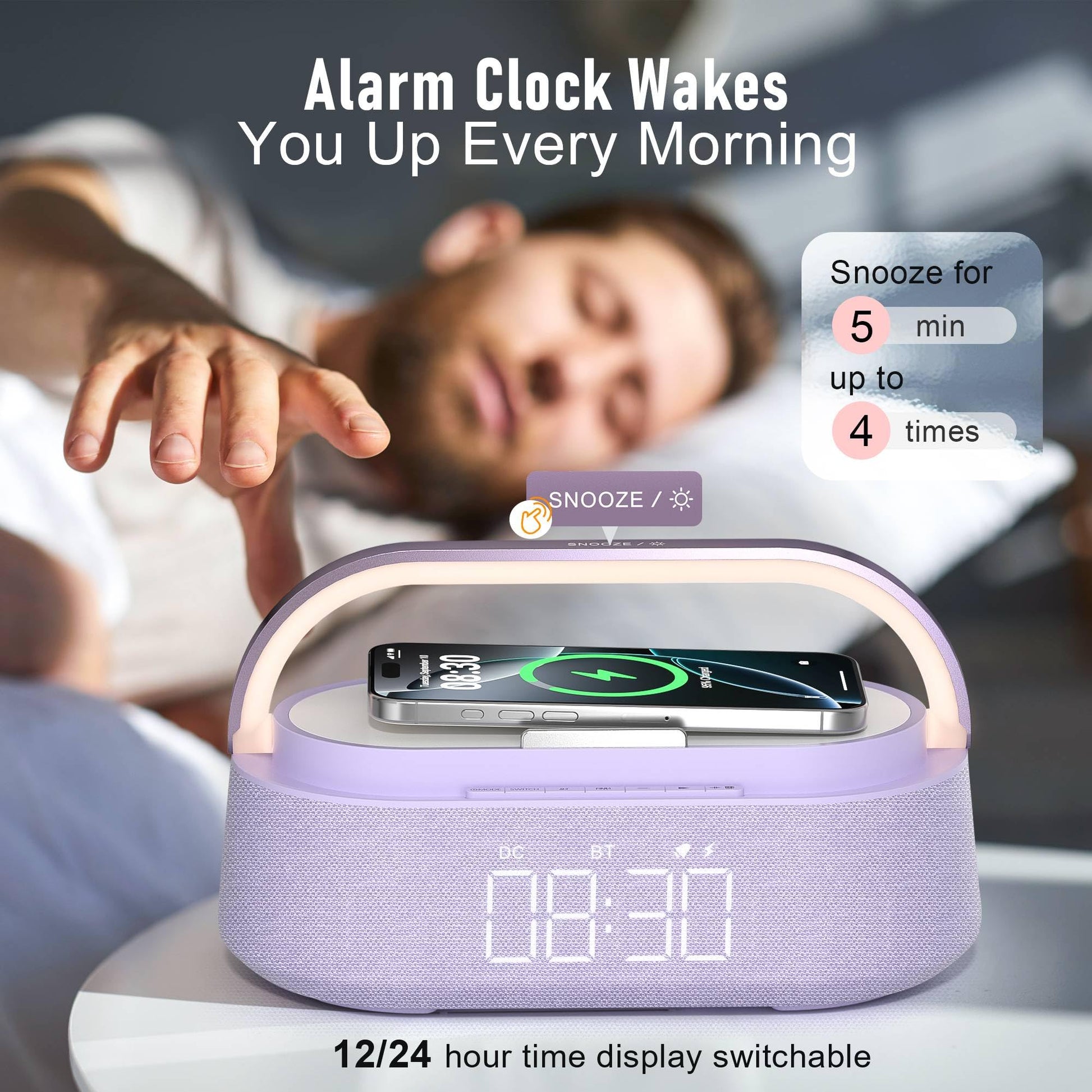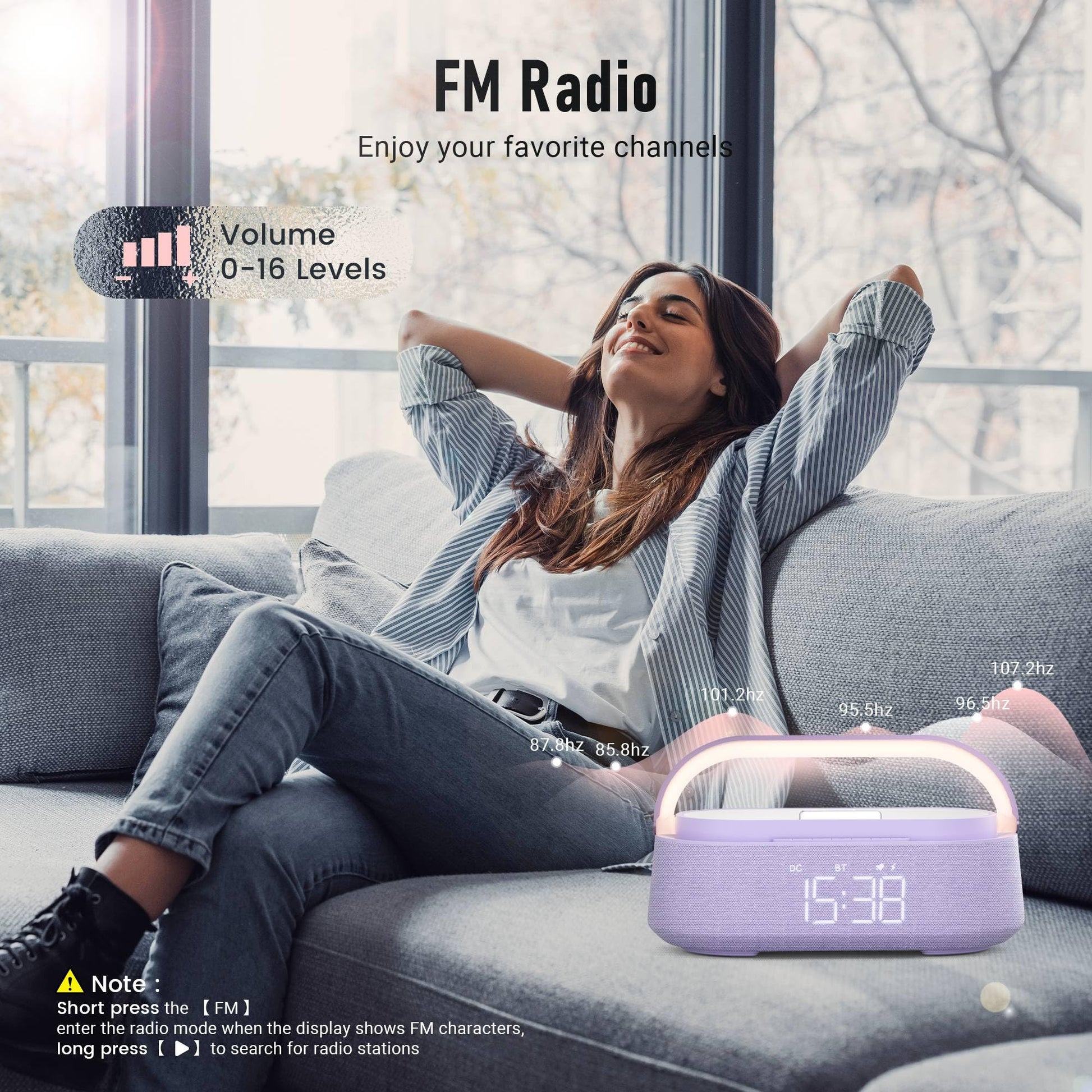 - 6-in-1 Design: FREEFISH Alarm Clock with Bluetooth speaker, wireless charger, FM radio, digital alarm clock, dimmer night light and phone holder. The multifunctional alarm clock meets most of your electronic needs in life. You are a little helper to improve the quality of life.